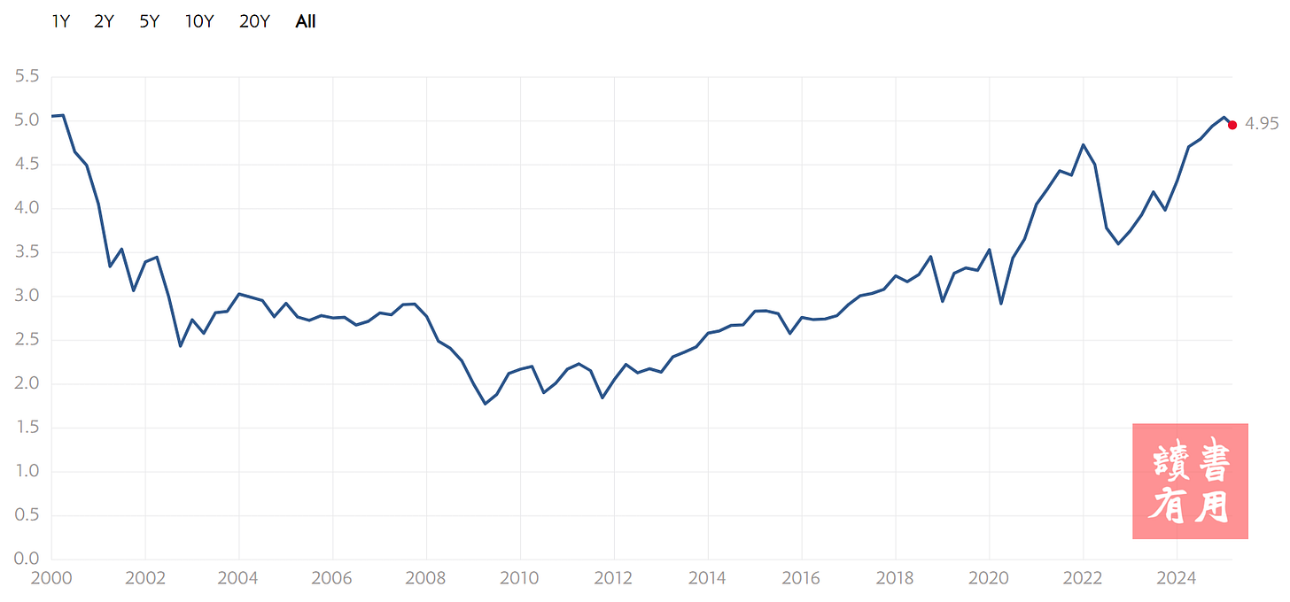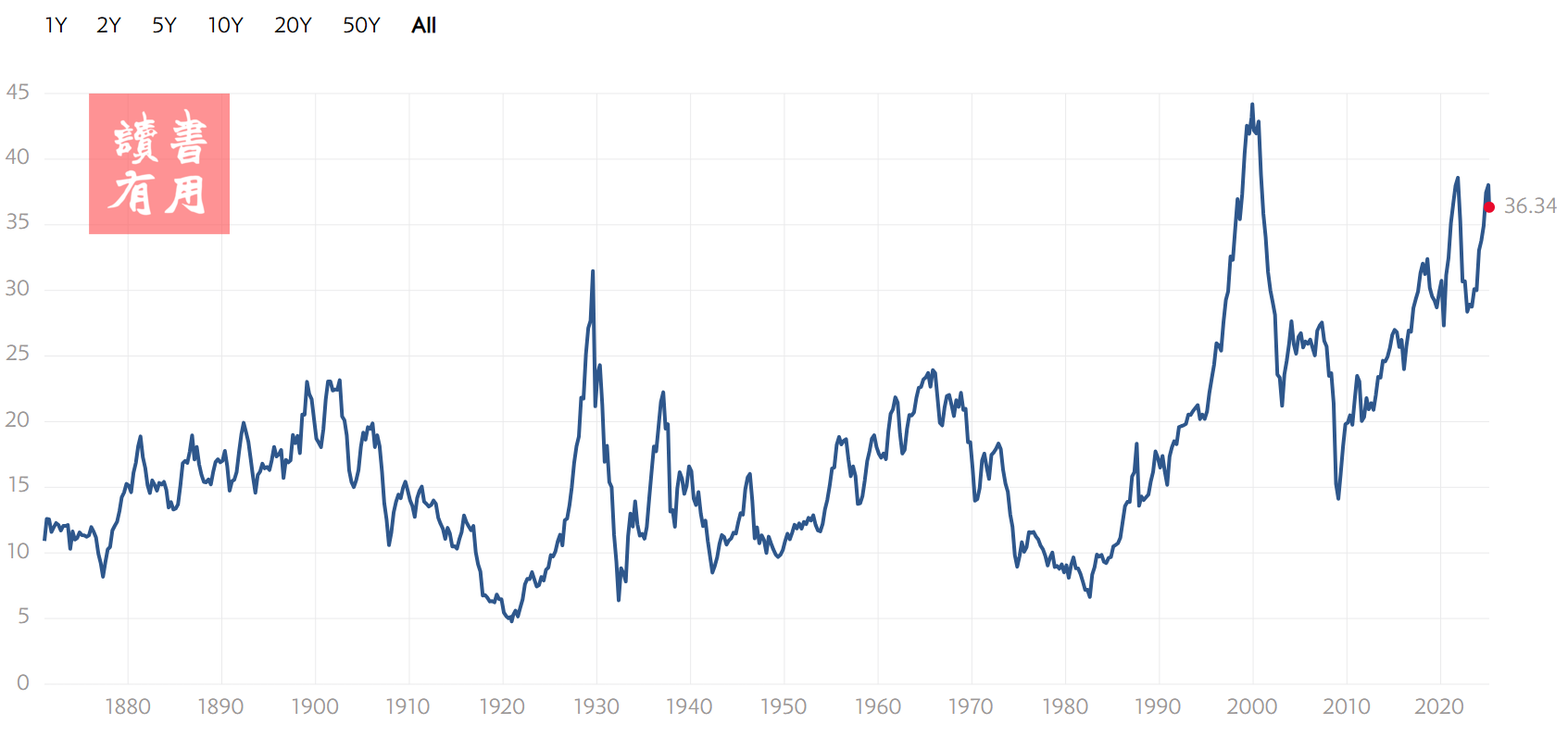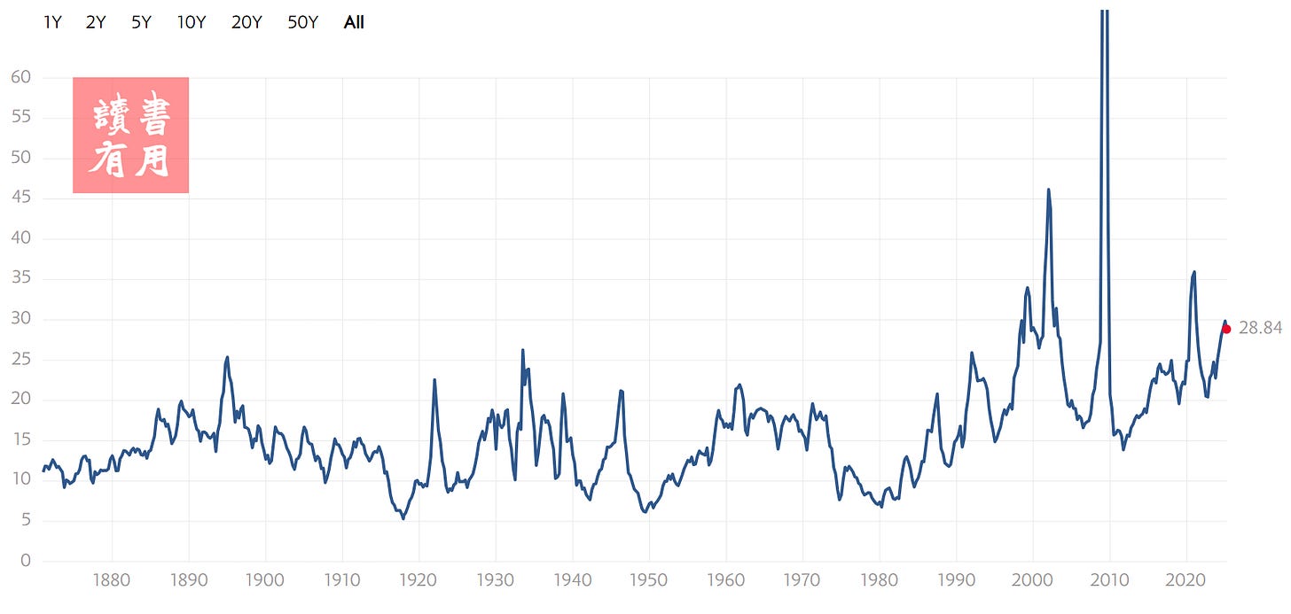 目前,S&P 500的週期調整市盈率(CAPE)即便在近期股市大幅回調後,依然處於歷史高位,顯示市場估值可能仍處於過熱區間。截至上週五(3月7日),S&P 500的CAPE比率為36.34,雖然較2024年底略有回落,但仍遠高於其長期平均值17.6。值得關注的是,這一比率僅在Dot-com泡沫時期和2021年時曾高於當前水平。此外,另一個相對次要的指標——市淨率(Price to Book Ratio)也顯示,當前數值與Dot-com泡沫時期的峰值相當。