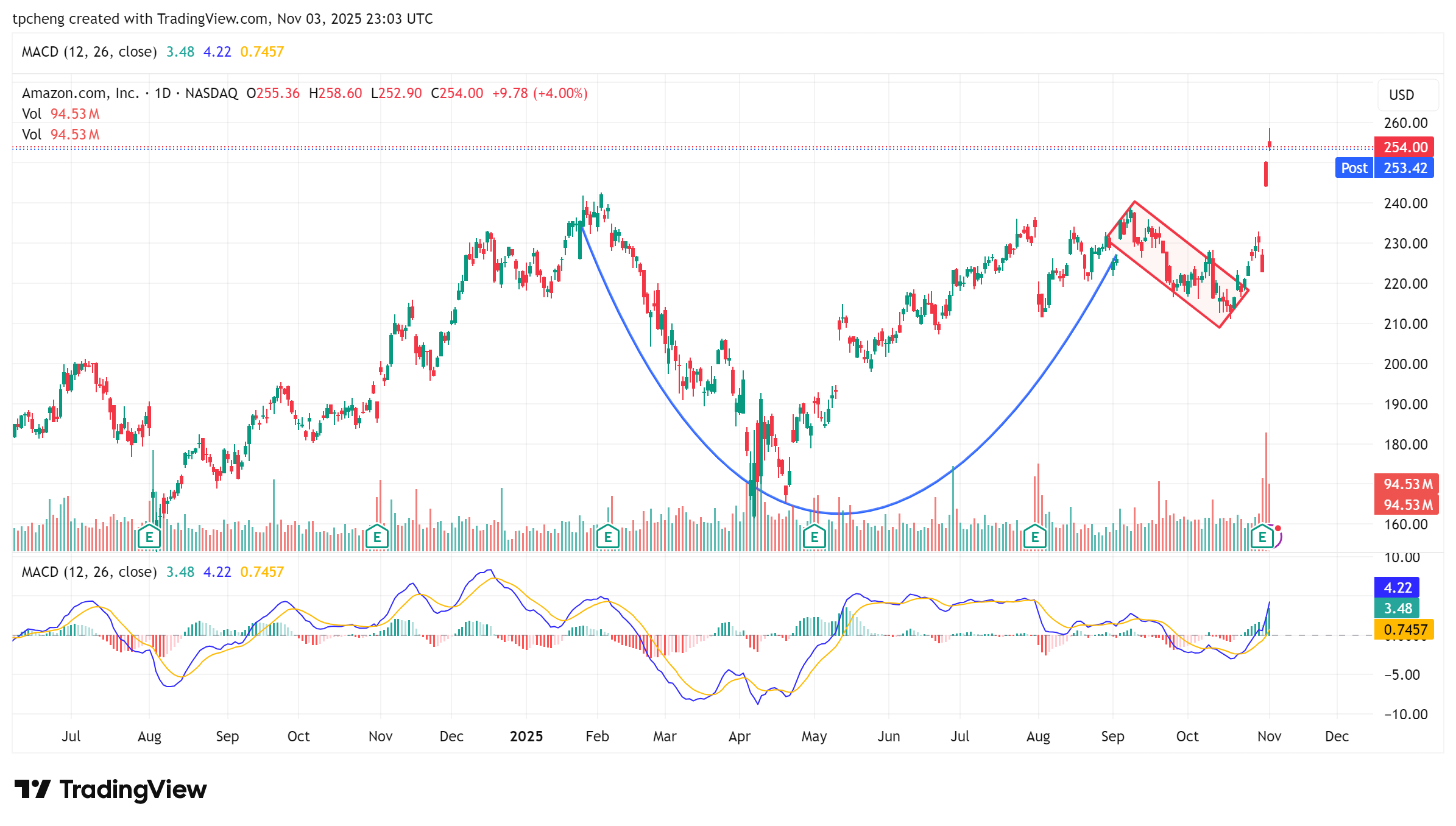 Amazon (AMZN):漲逾 4%,創歷史新高,宣布與 OpenAI 達成 380 億美元合作。