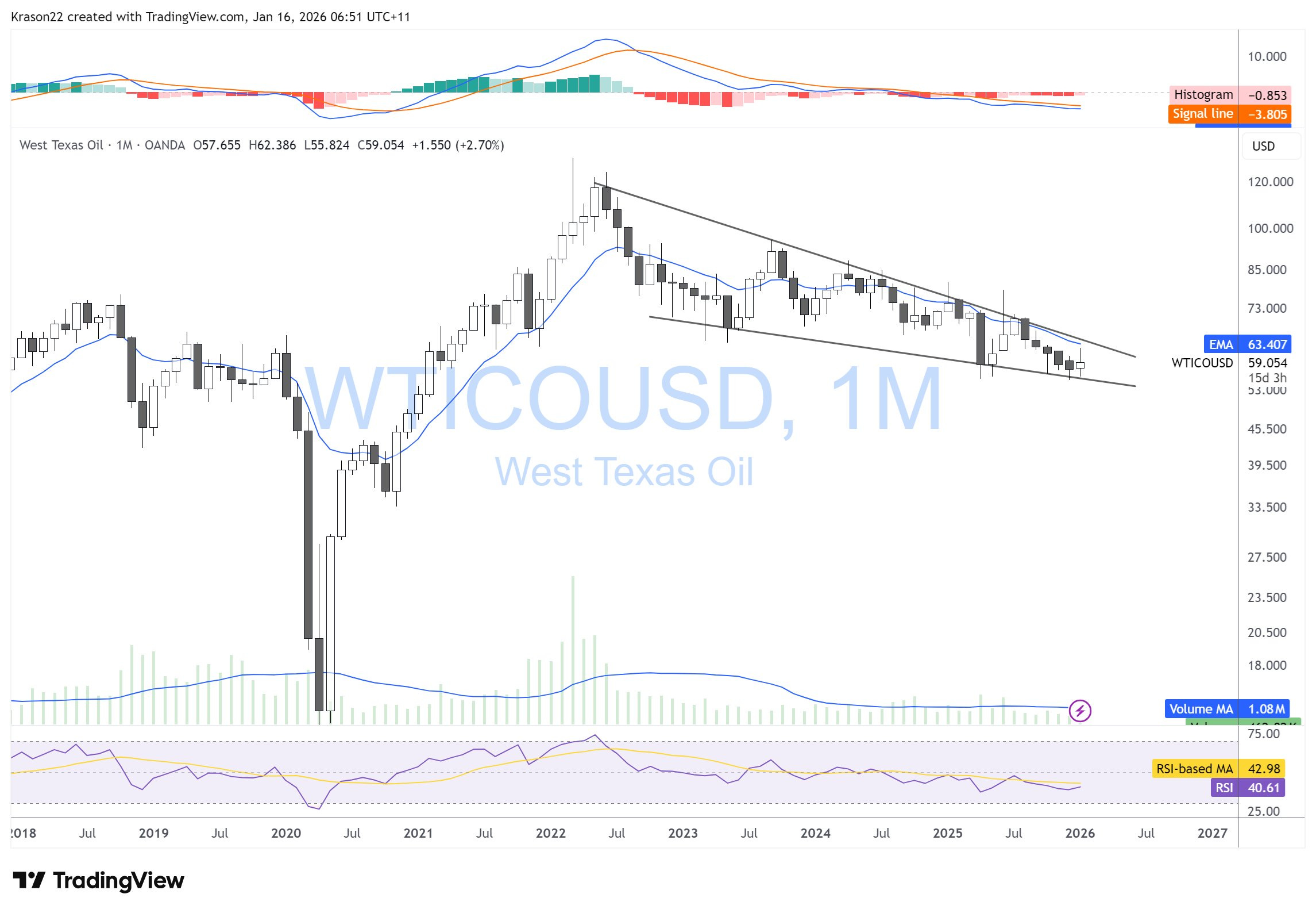 油價大跌:因川普總統暗示美國將暫緩對伊朗進行軍事回應,市場對地緣政治風險的擔憂減輕,導致西德州原油(WTI)與布蘭特原油價格週四早盤重挫約 4% 至 5%,WTI 跌破每桶 59 美元 。