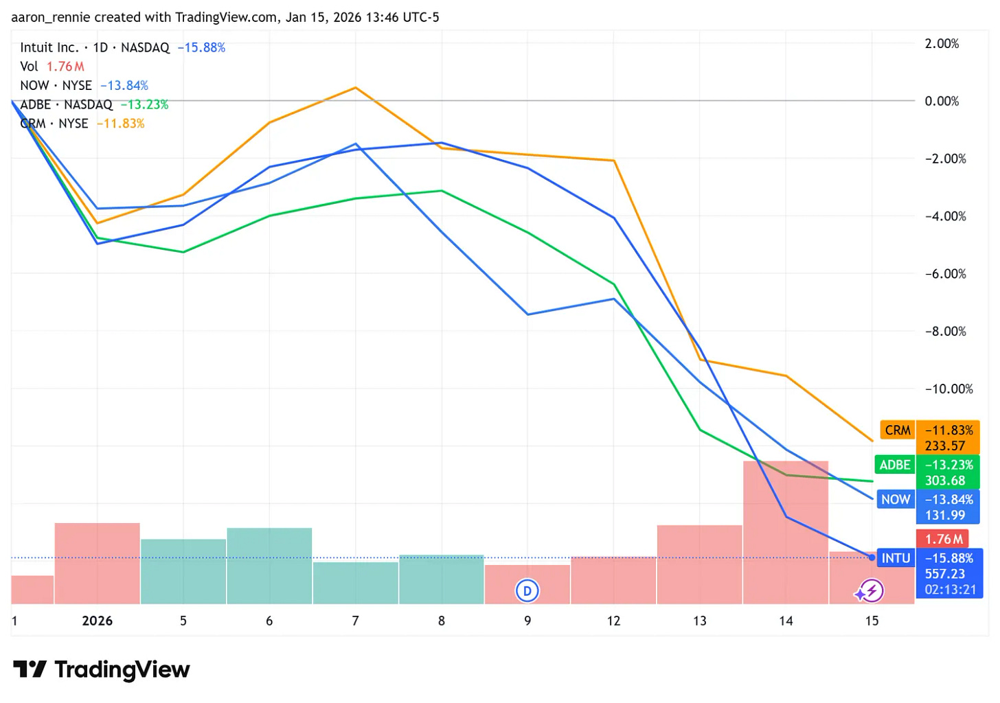 軟體股疲弱:儘管大盤上漲,軟體股表現不佳。Intuit (INTU)、ServiceNow (NOW)、Adobe (ADBE) 和 Salesforce (CRM) 自 2026 年初以來跌幅顯著,其中 Intuit 下跌超過 15% 。