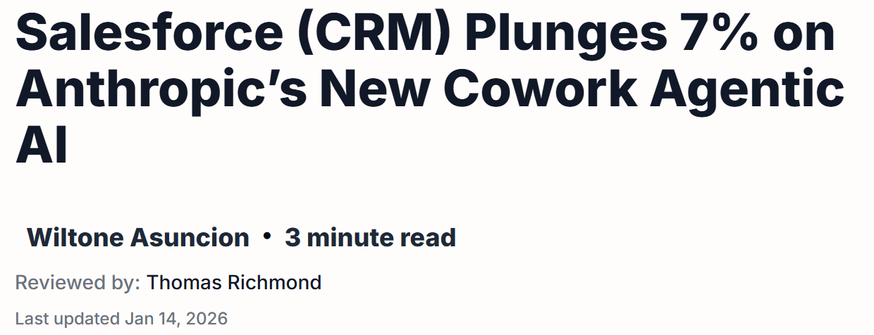 Anthropic 發布了名為「Cowork」的預覽版工具 。這不僅是一個產品的發布,更象徵著 AI 正在從「輔助工具」跨越到「替代勞動力」的臨界點。結果:Salesforce (CRM) 單日暴跌 7%,創下自 2024 年 5 月以來的最大跌幅 。這不僅僅是市場情緒的波動,更是軟體產業結構性板塊移動的訊號。