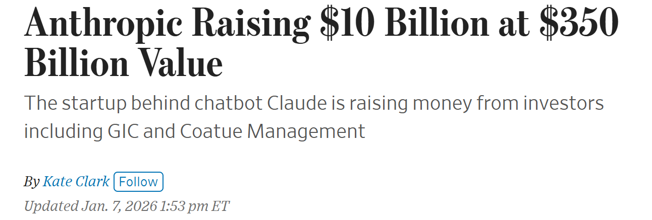 Anthropic 完成 100 億美元的融資,投後估值來到 3,500 億美元,或是指極高的營收倍數,其營收成長驚人,從 2023 年底的 1 億美元,預計到 2025 年底將達到 90 億至 100 億美元 。如果其成長能持續,目前的昂貴估值在未來一年後看起來會很便宜 。