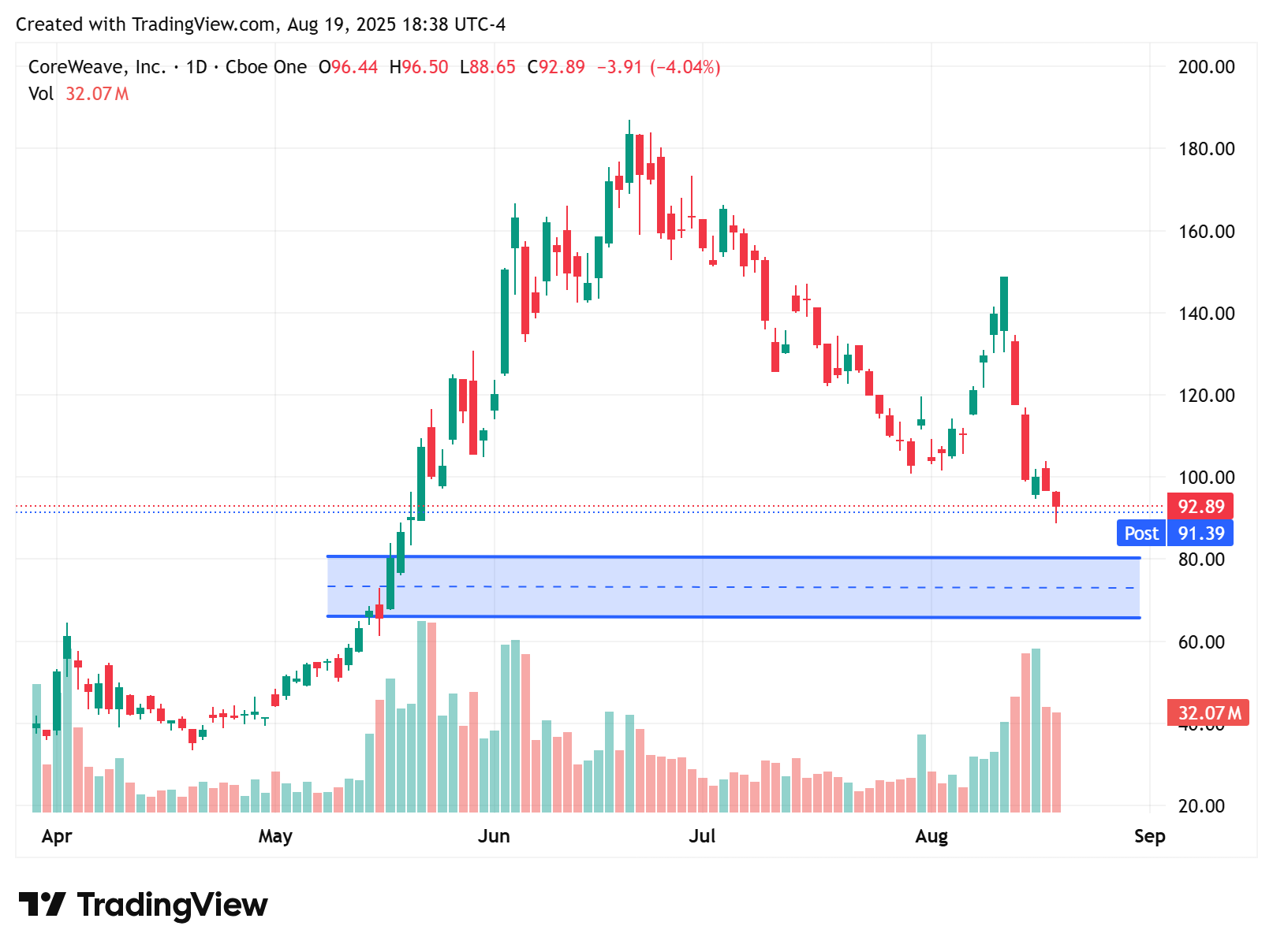 CRWV:187 → 88.65 美元,腰斬後收回 90 美元,若守不住 → 下看 80 / 65