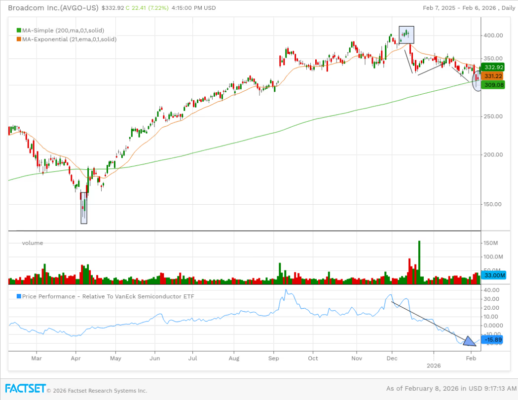 Broadcom (AVGO):在 $300 關卡與 200 日均線形成看漲錘頭線,若突破 $335 (21MA),目標上看 $400。