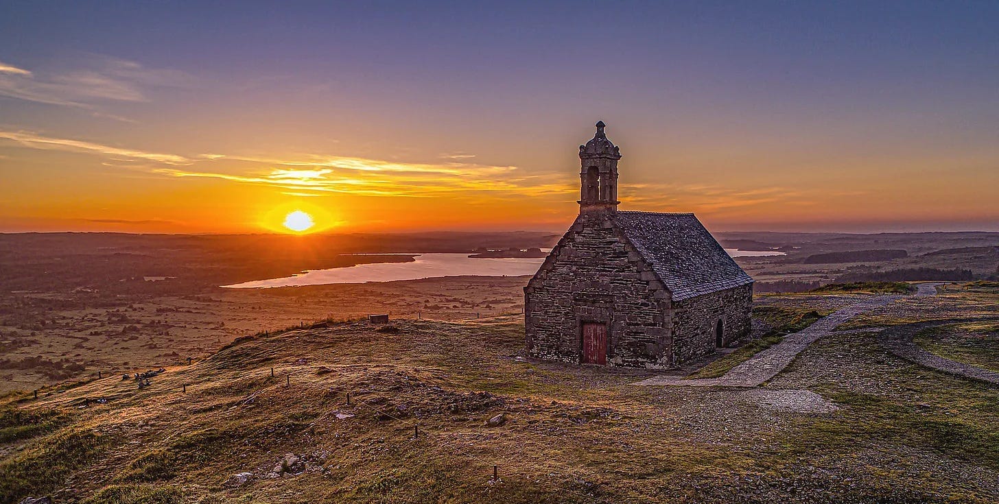 在聖米歇爾山以南約 200 英里處,布列塔尼地區矗立著一座鮮為人知的雙生地——「布拉斯帕爾的聖米歇爾山」(Mont-Saint-Michel de Brasparts)。儘管規模較小,卻在能量與靈性層面與本尊遙相呼應。聖米歇爾小禮拜堂(Chapelle Saint-Michel-de-Brasparts)坐落於阿黑山脈(Monts d’Arrée)山頂上,彷彿守護著這片古老且神秘的高地。