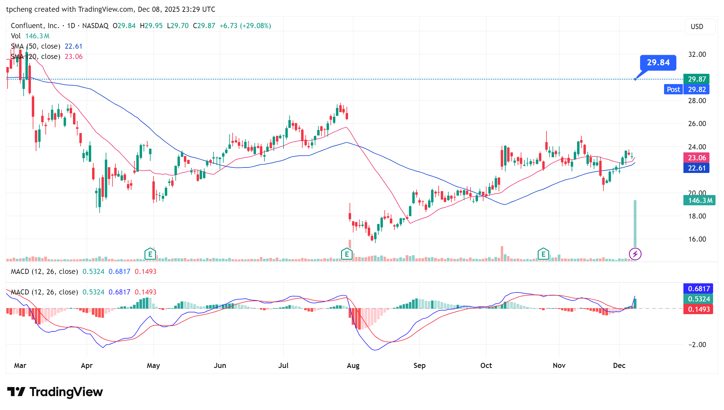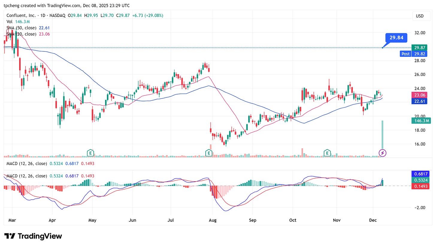 IBM 正以約110億美元收購資料流平台 Confluent (CFLT),以加強企業級資料與 AI 基礎設施佈局。CFLT 股價暴漲約30%。