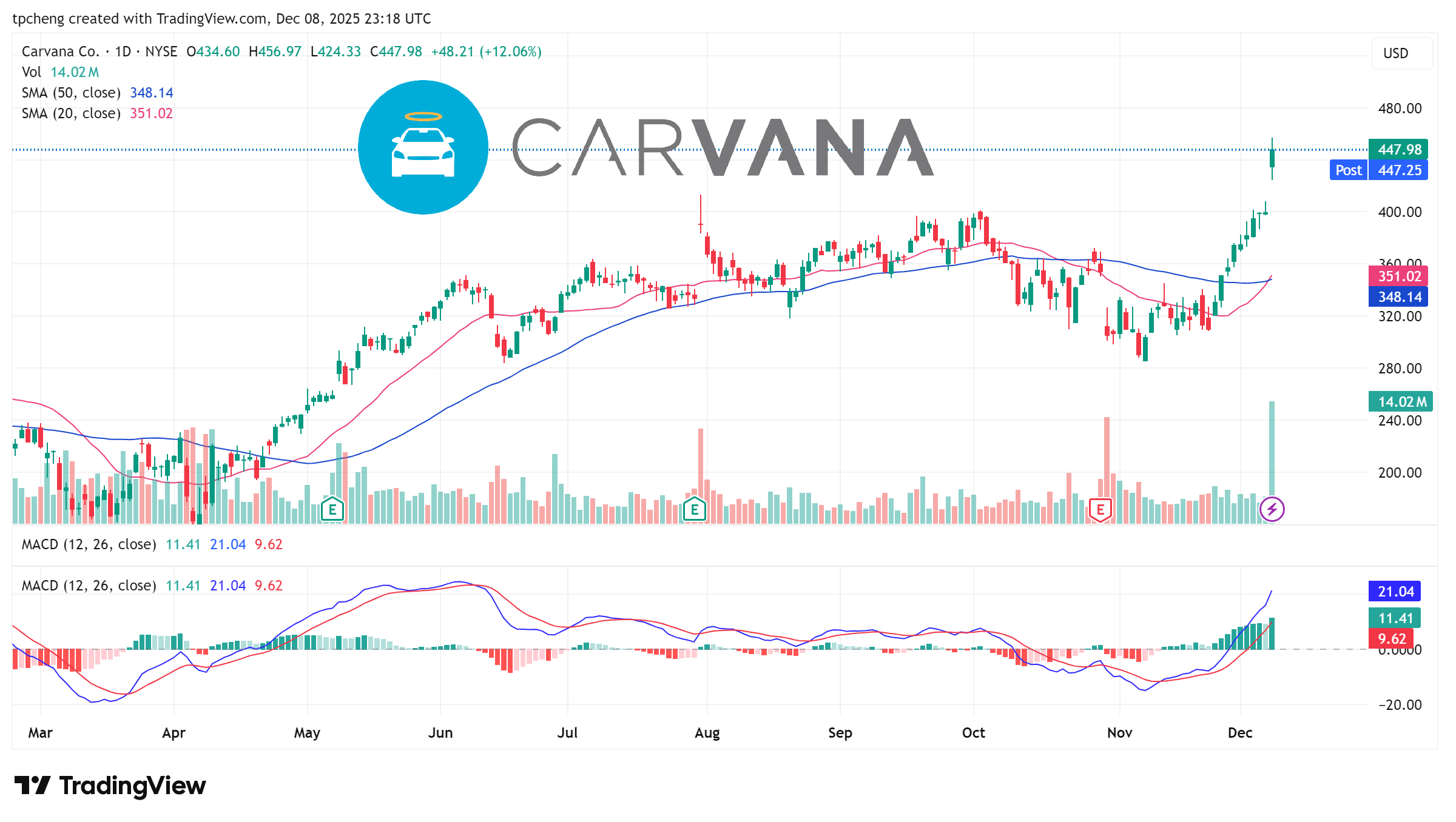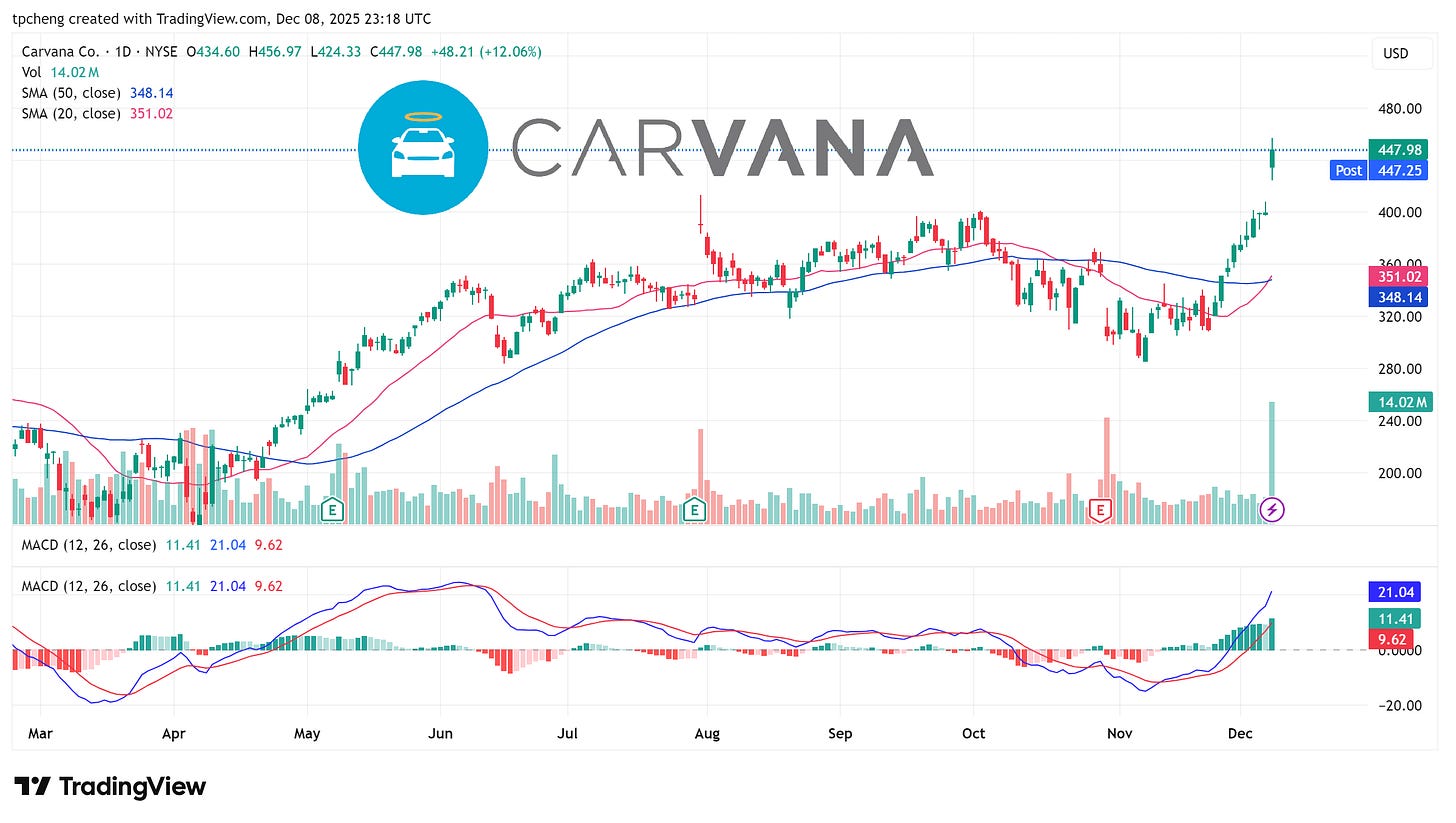 Carvana 股價大漲12%,分析師認為其基本面顯著改善,預計2026年銷量將超越 CarMax。