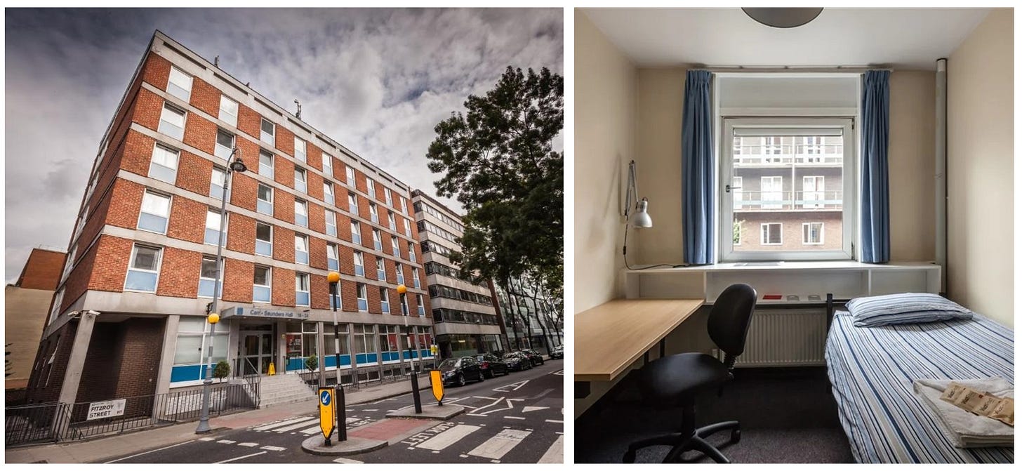 當時我透過《Lonely Planet》的資訊,訂下位於倫敦市中心 Warrent Street 站附近、隸屬倫敦政經學院(LSE)的宿舍 —— Carr-Saunders Hall。由於 LSE 的宿舍在學期間為學生專用,但一到長假便會全數清空、搖身一變成為對外開放的旅館,讓一般旅客也能入住。