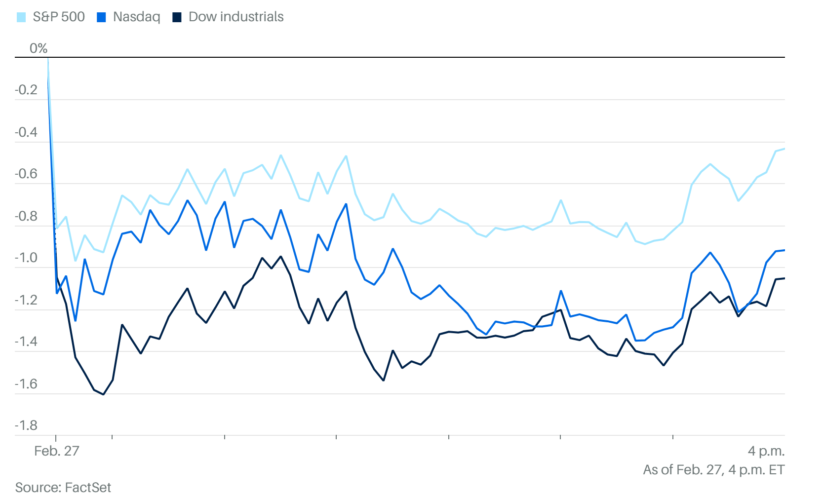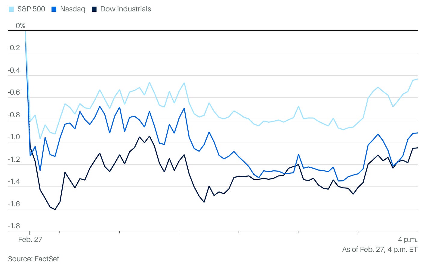 道瓊指數:今日領跌,跌幅達 1.1%(約 520 點)。儘管如此,道瓊依然在二月勉強維持了 0.2% 的微弱漲幅,實現了連續第十個月的月線增長 。