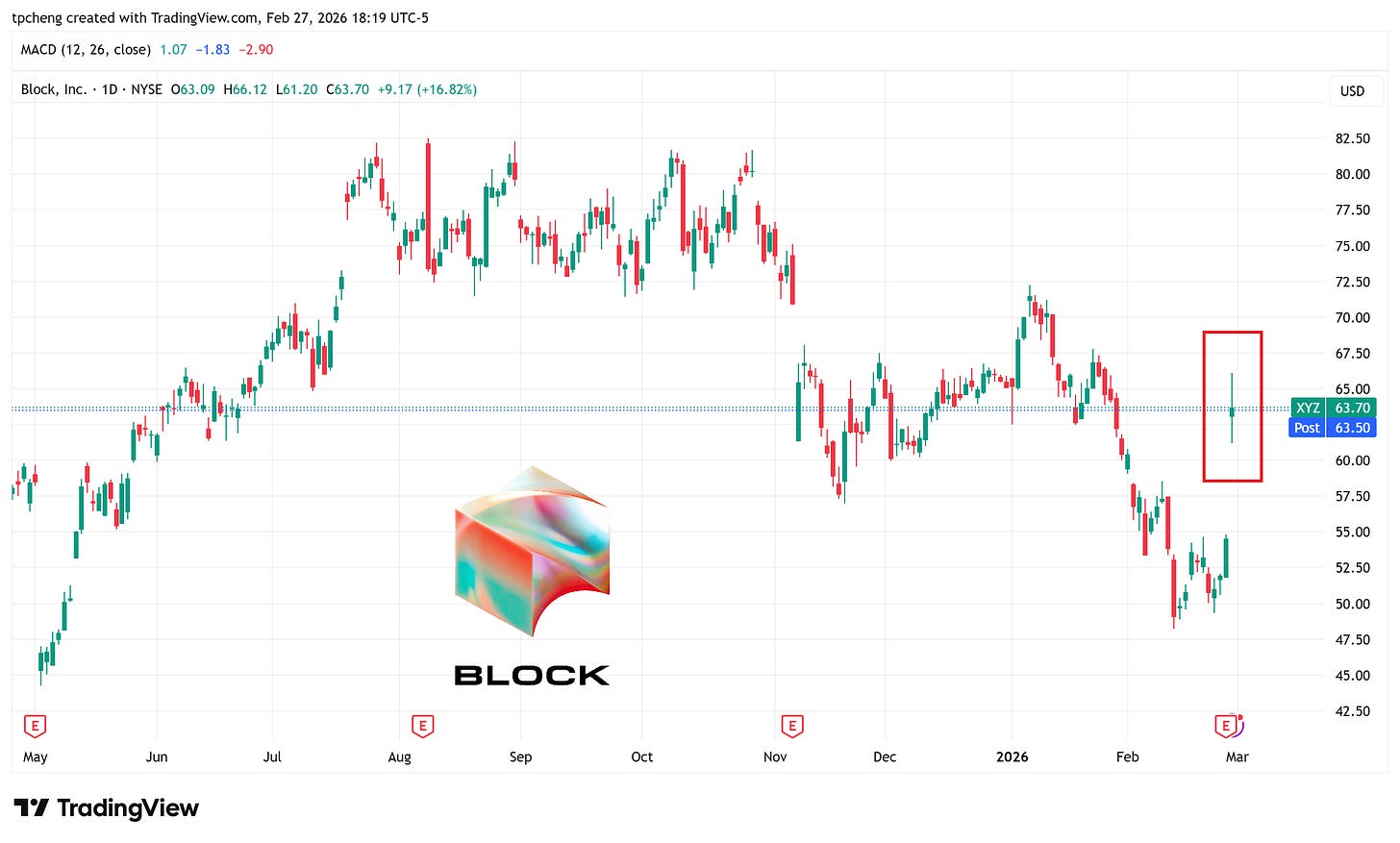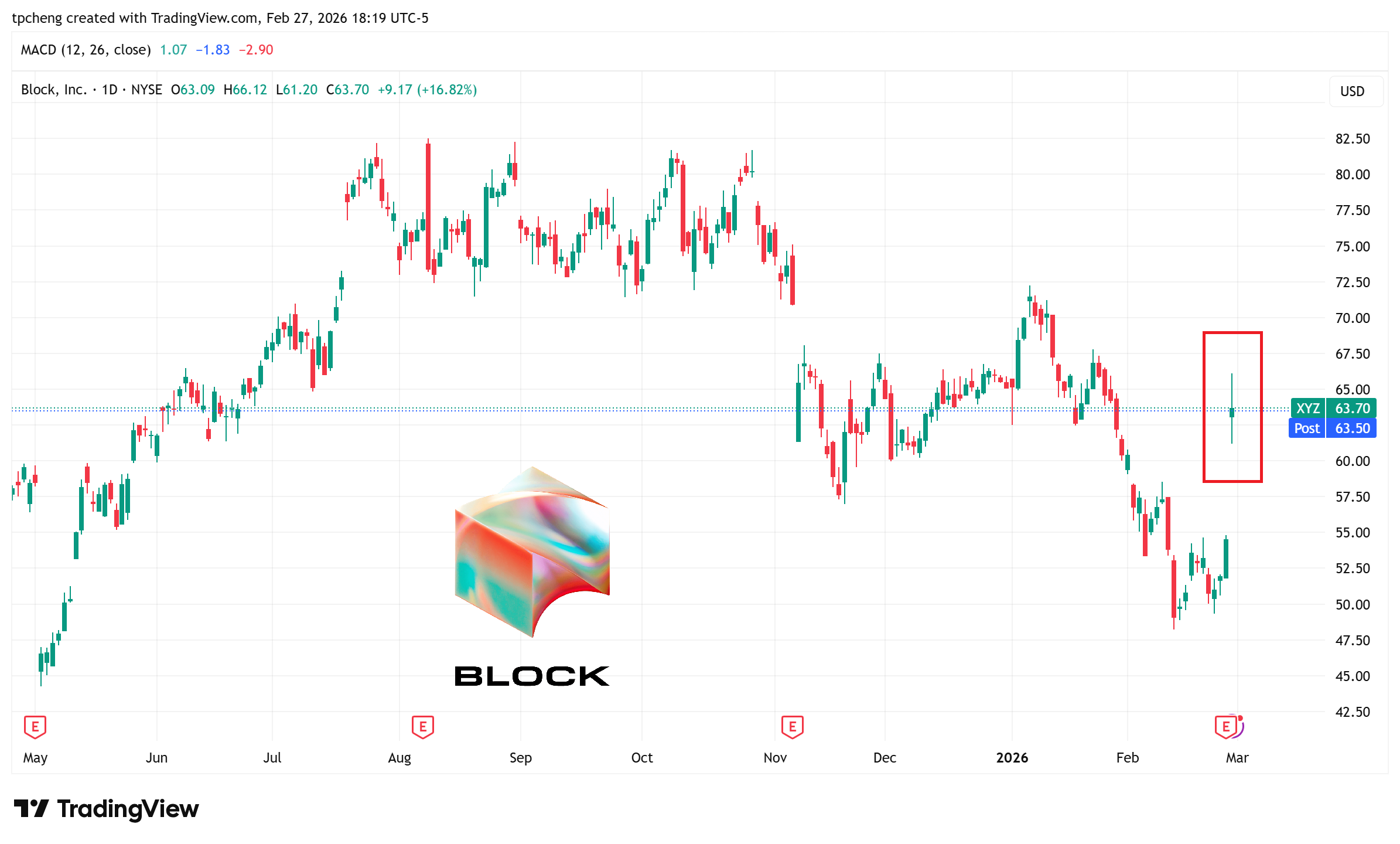 由 Jack Dorsey 領導的支付巨頭 Block (XYZ) 今日收盤大漲 18%,盤後更一度飆升超過 22% 。這背後是一個令人戰慄的決定:Dorsey 宣佈將裁減近一半的員工(約 4,000 人),理由是 AI 工具已經能自動化處理大量工作,足以支持公司轉向更高效的營運模式 。
