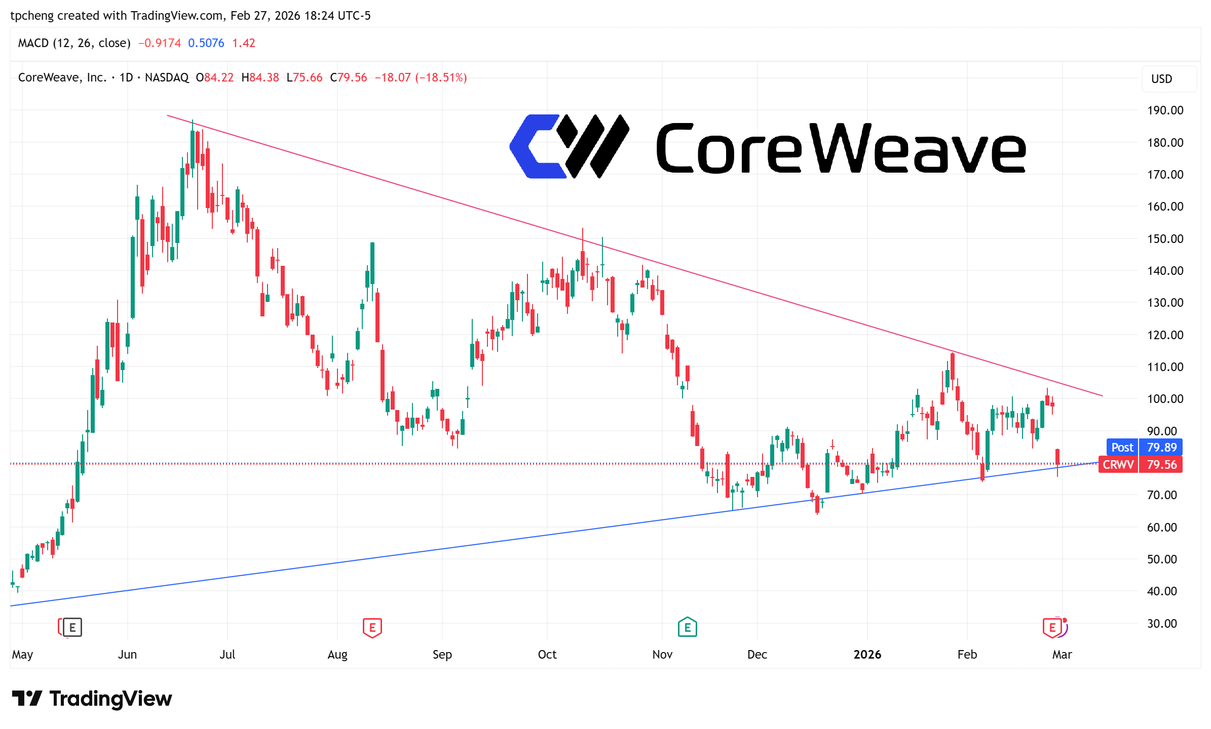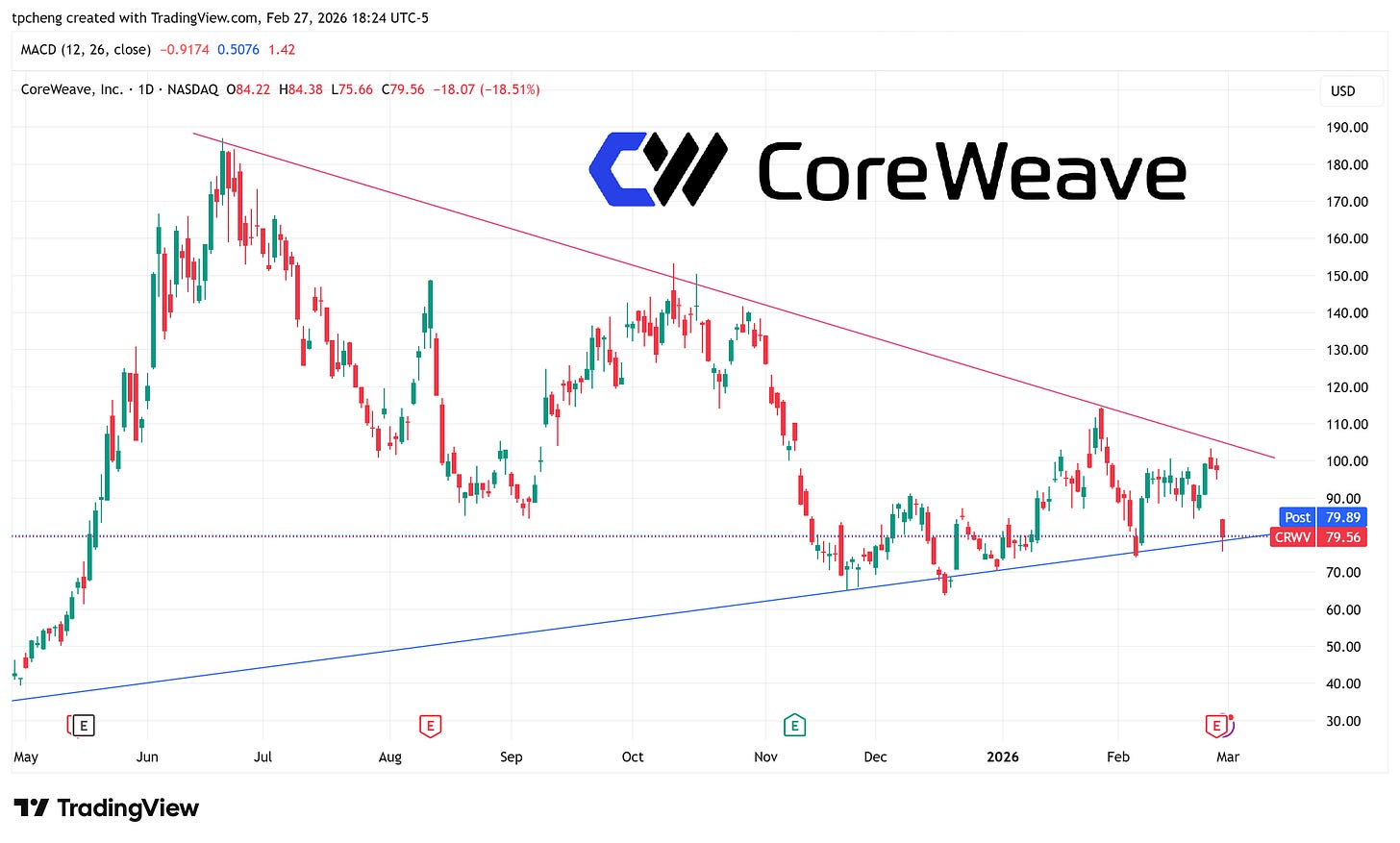 並非所有 AI 相關公司都能獲得市場青睞。AI 資料中心營運商 CoreWeave (CRWV) 因第四季虧損大於預期且未來資本支出(CapEx)暴增至 350 億美元,引發投資者對其負債過高的擔憂,股價重摔 19% 。