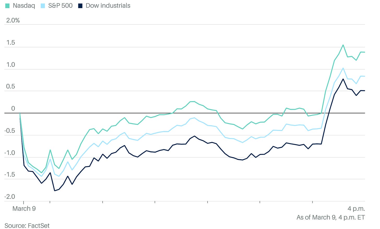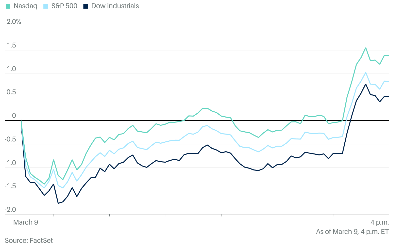 今日美股三大指數全數收紅,抹平了早盤因油價飆漲帶來的慘重跌幅: