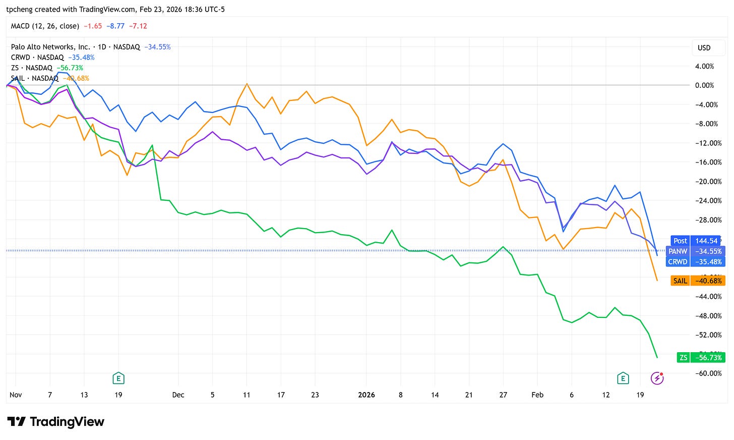 IBM (-13.5%):除了報告影響外,Anthropic 推出可自動化分析與轉化舊有 COBOL 代碼的 Claude Code 工具,直接威脅到 IBM 賴以生存的大型主機諮詢與軟體現代化業務 。