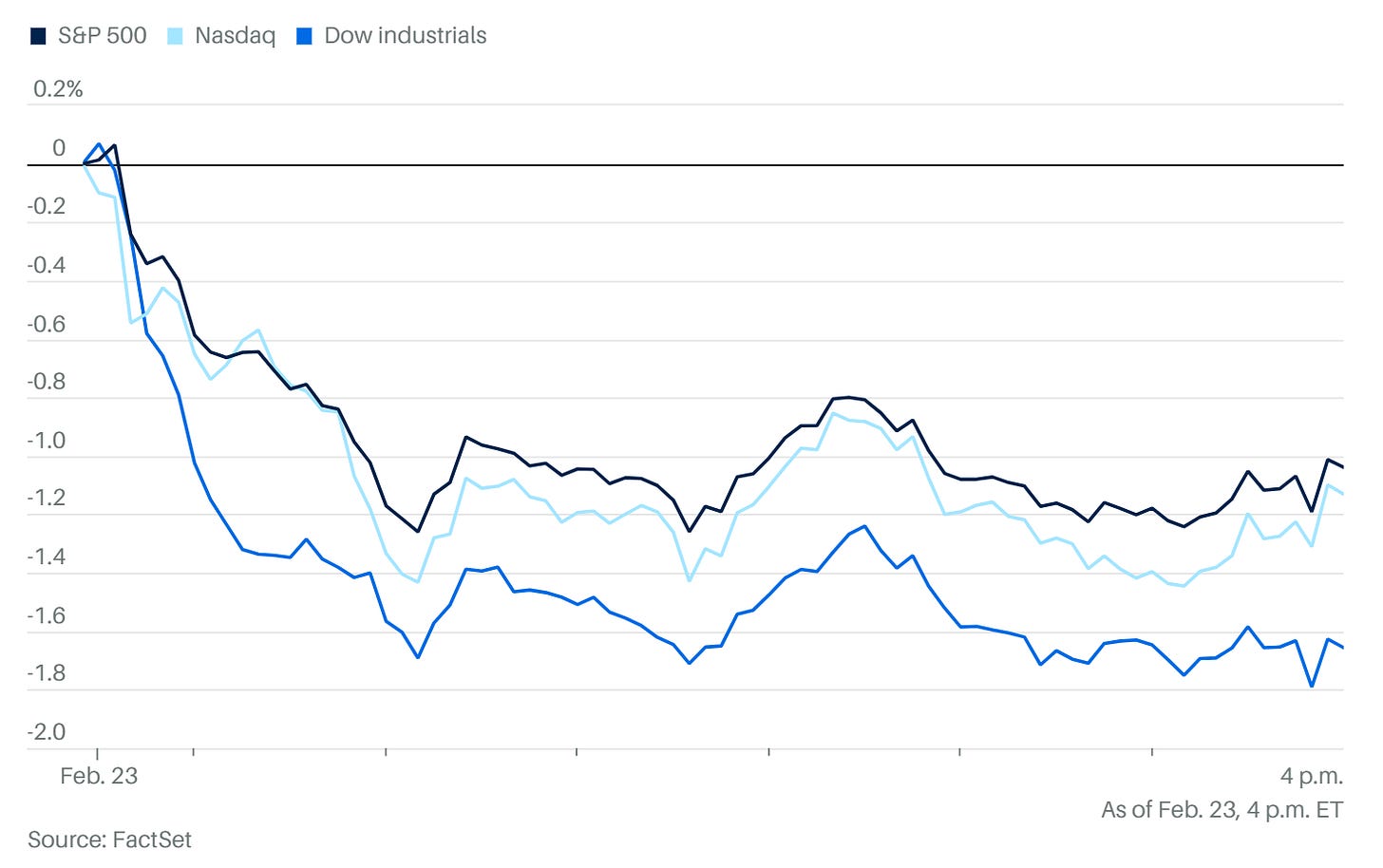 今日的美股市場彷彿籠罩在一層「AI 焦慮」與「關稅不確定性」交織的迷霧中 。道瓊指數重挫逾 800 點(約 1.7%),標普 500 與納斯達克指數也雙雙跌逾 1% 。市場情緒的轉變極其迅速,尤其是一篇病毒式傳播的「末日預言」,正讓華爾街重新審視 AI 帶來的究竟是紅利還是災難 。