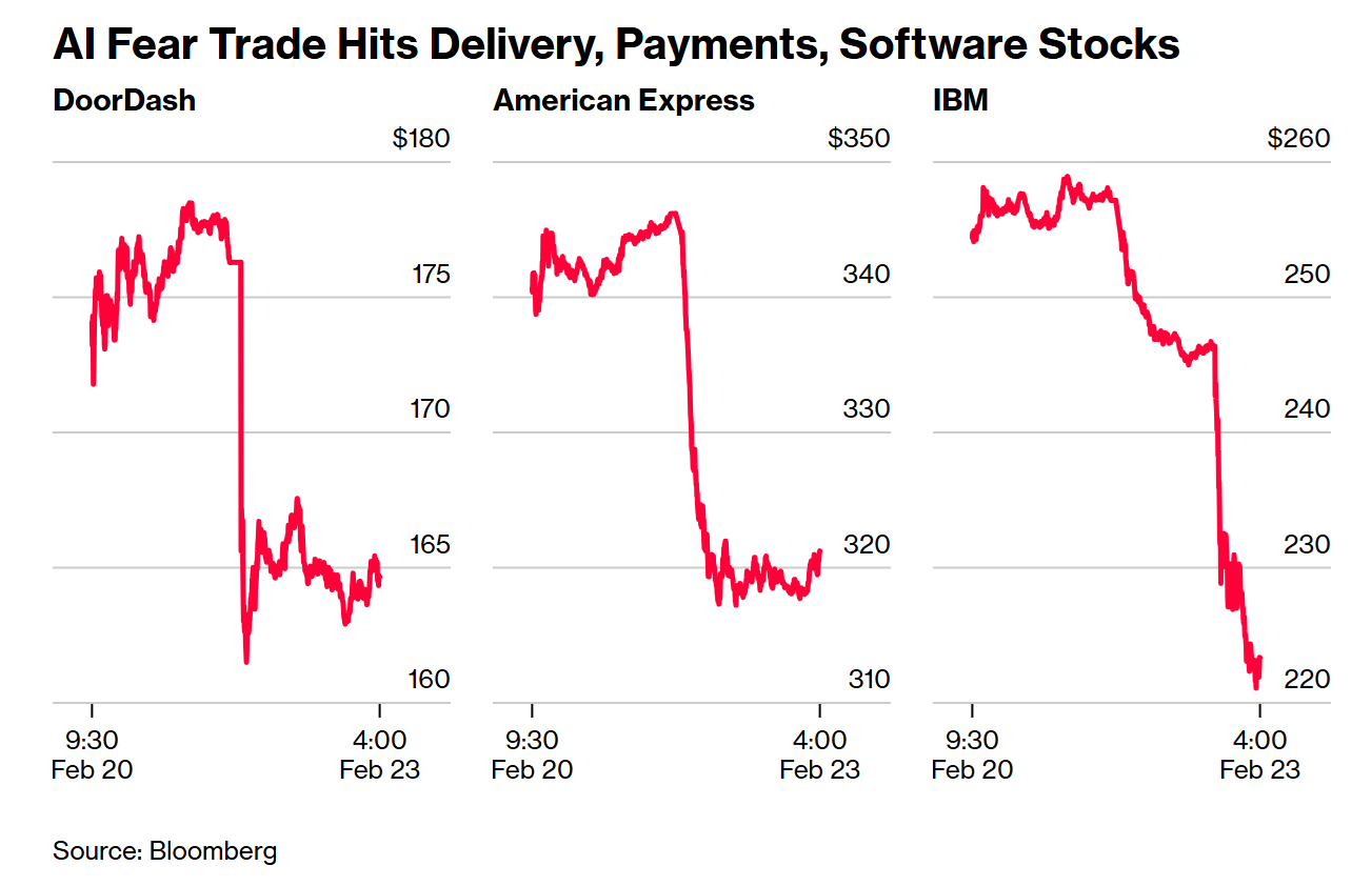 金融與信用卡發卡商:American Express (-7.9%)、Capital One (-8.0%) 以及 Visa、Mastercard 均大幅下跌 。市場擔心白領失業導致刷卡量下降,且 AI 代理可能選擇更便宜的支付方式(如穩定幣)而非傳統信用卡 。