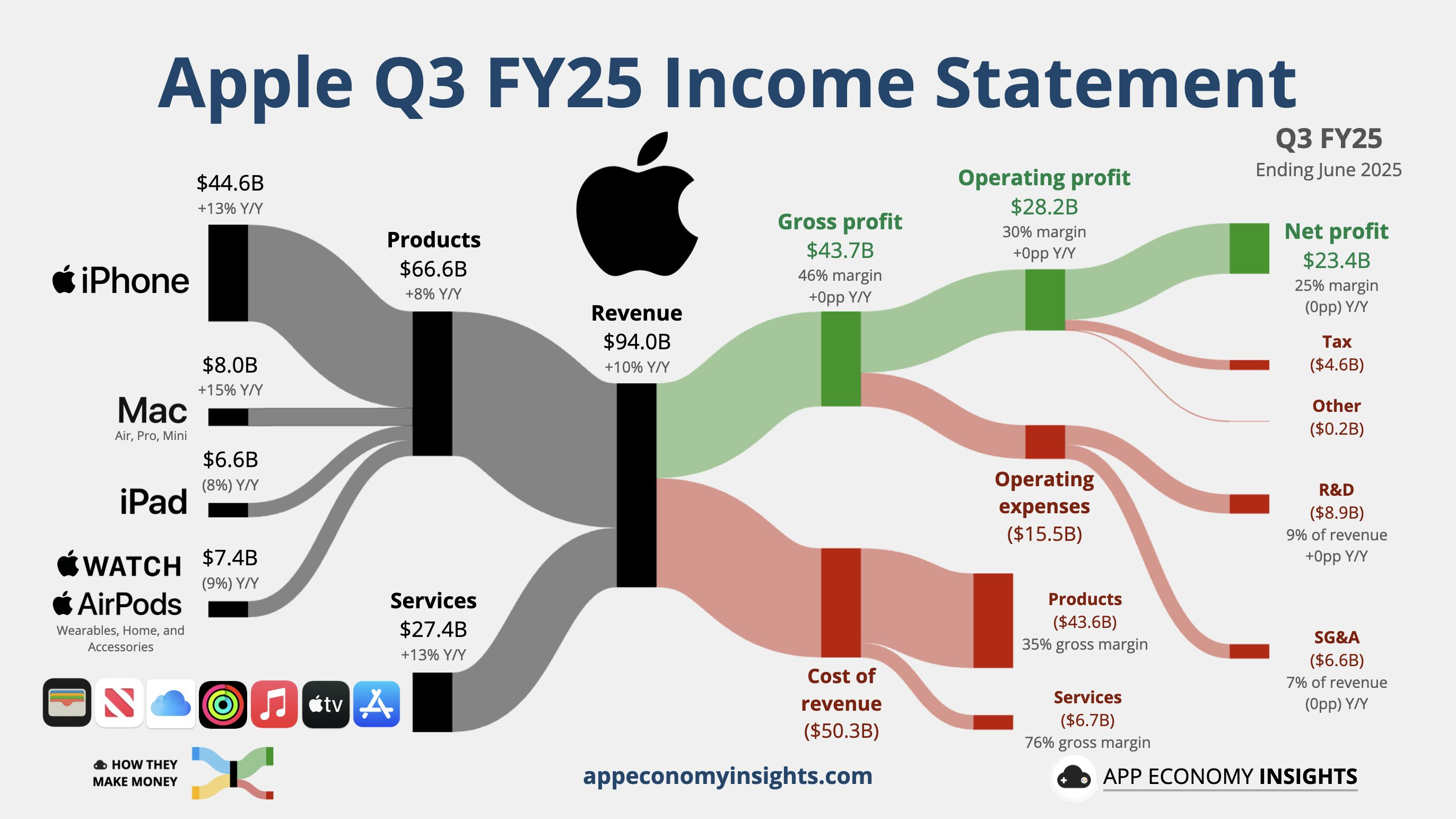 iPhone、Mac、服務營收皆雙位數成長,iPhone收入達 $440億(預期 $398億),服務收入 $274億(預期 $268億)。