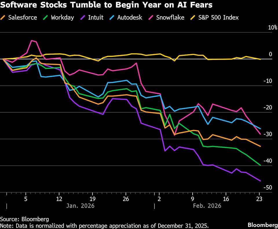 軟體股近期的「跌跌不休」源於對 Anthropic 等 AI 巨頭入侵領地的恐懼 。