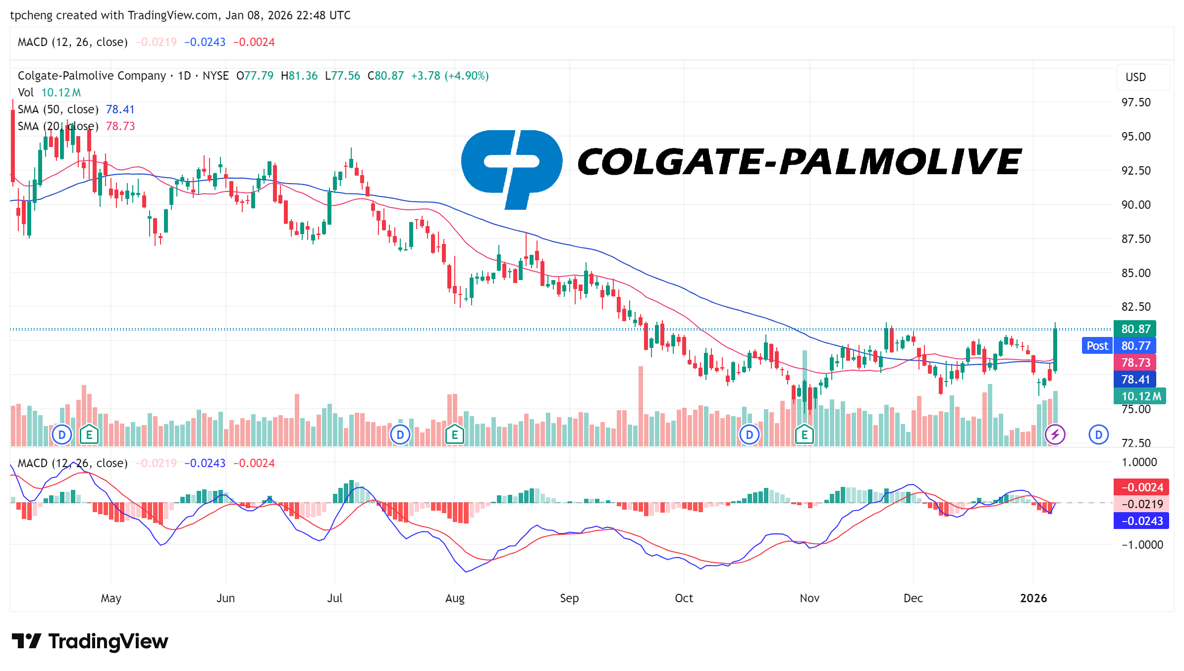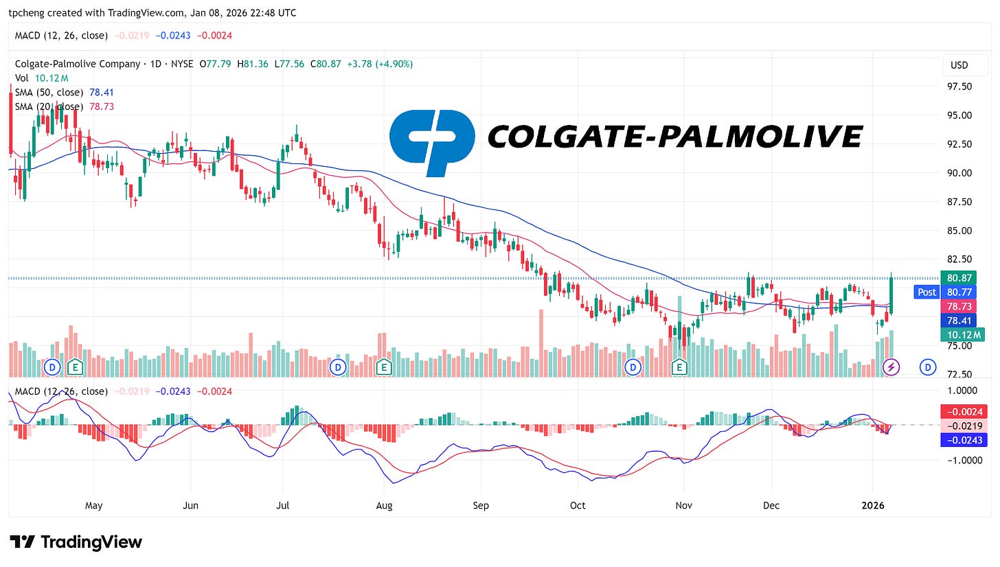 Colgate-Palmolive(CL):上漲 5%,股價超過 $81。原因:Morgan Stanley 將其列為消費類首選股,目標價看 $87 。