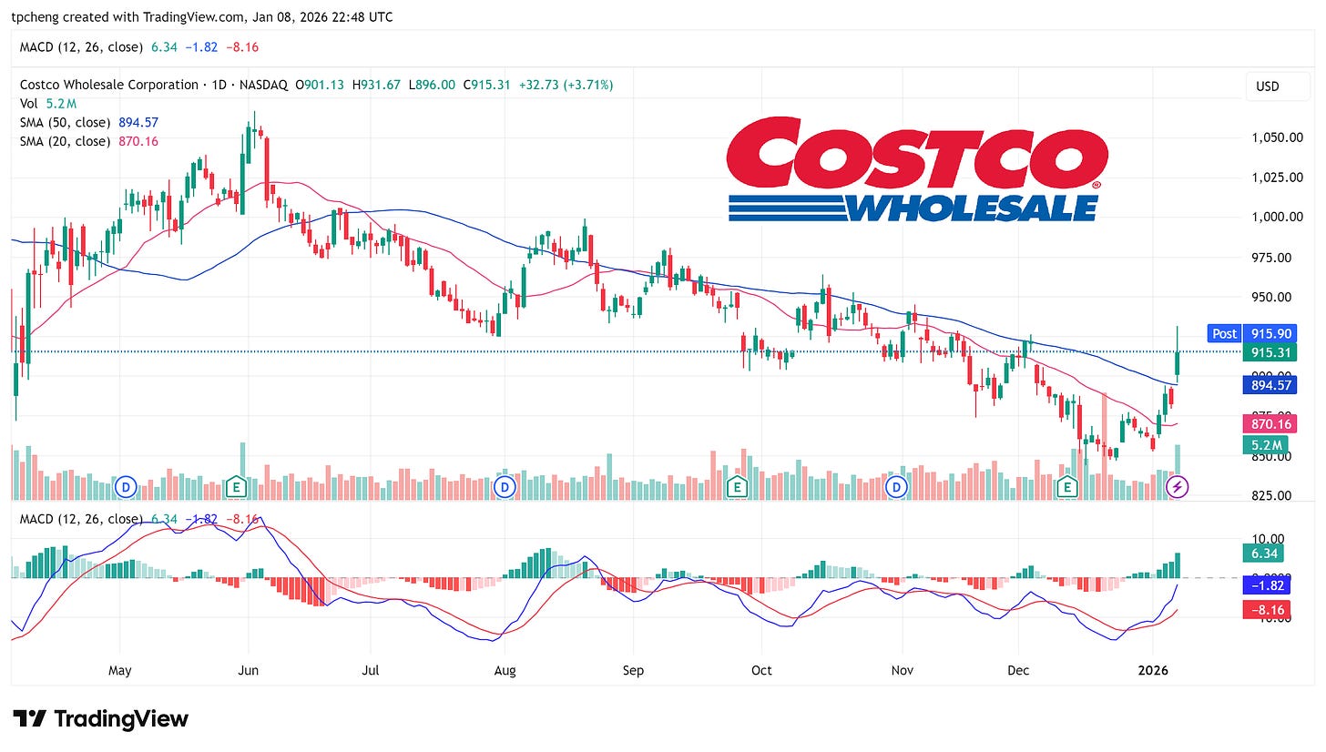 Costco(COST):上漲約 5%。原因:12 月銷售額年增 8.5%,同店銷售增長 7%,優於市場預期 。