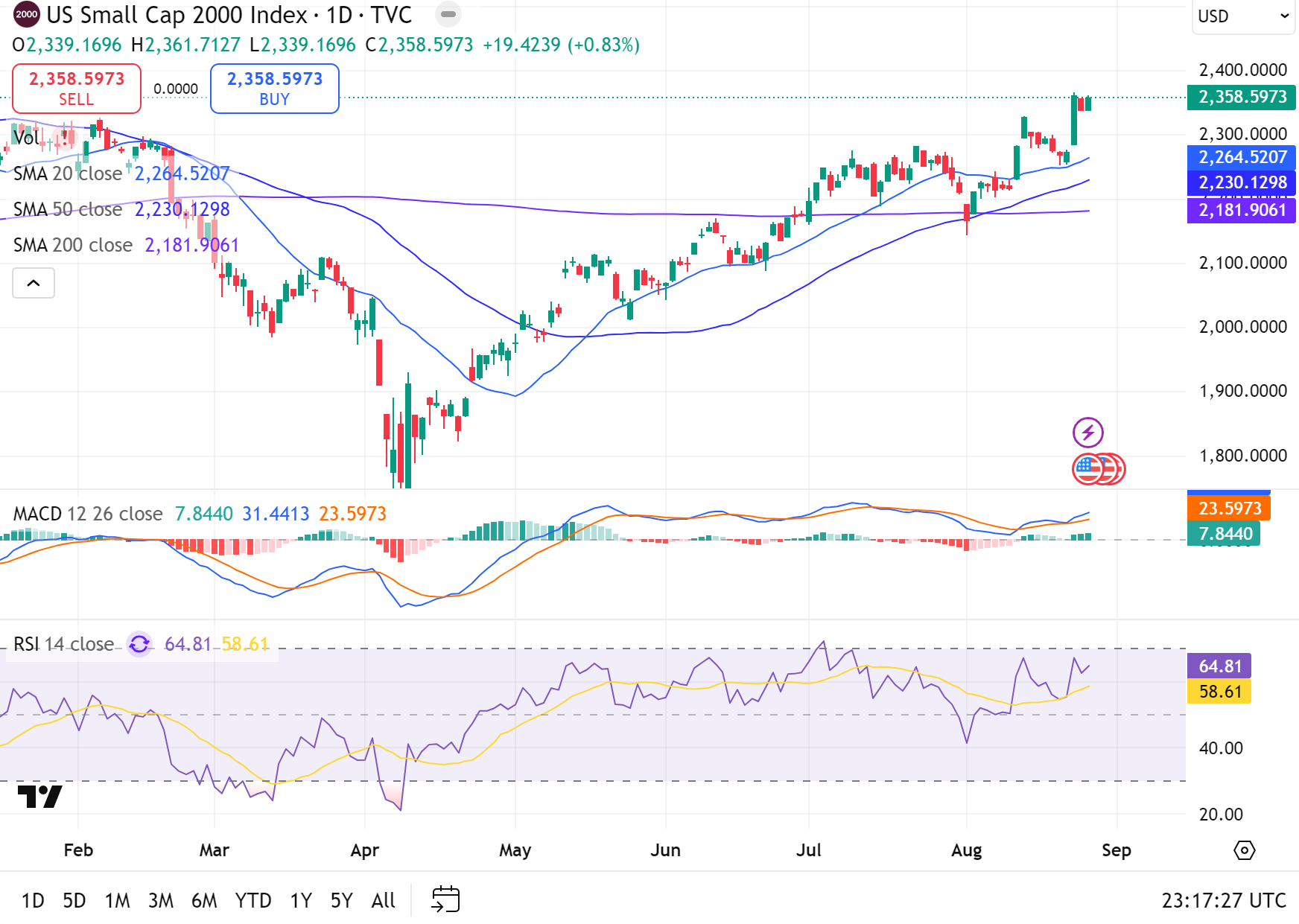 羅素2000指數(追蹤市值最小的 2000 檔股票)週二收盤前上漲 0.7%,全天表現領先其他主要指數。