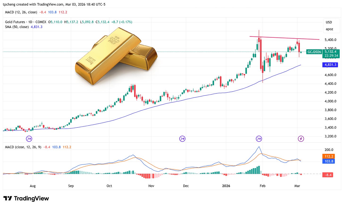 出乎意料的是,黃金在戰爭期間並未發揮避險功能,週二大跌約 4% 至每盎司 5,125 美元 。 主因在於美元指數(DXY)走強至三個月高位(98.97) 。強勢美元增加了外國投資人持有黃金的成本,加上債券殖利率上升,使得不孳息的黃金失去吸引力 。此外,部分交易員可能因股市大跌而被迫拋售黃金以籌措現金(追繳保證金) 。