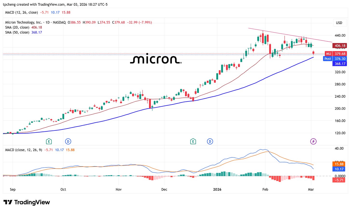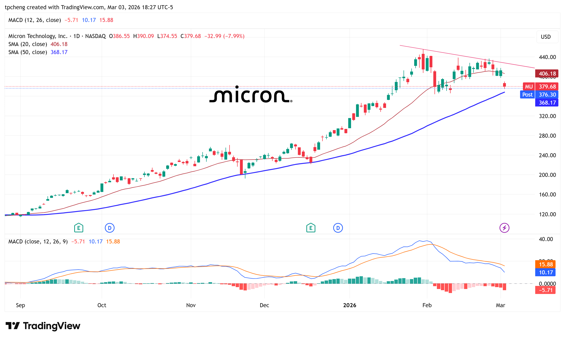 Micron (MU): 週二股價重挫 7.1% 。儘管公司宣布開始出貨最新的 AI 資料中心用 LPDRAM 模組,且高盛將目標價上調至 360 美元,但能源成本與供應鏈中斷的恐懼仍蓋過了技術面的利多 。