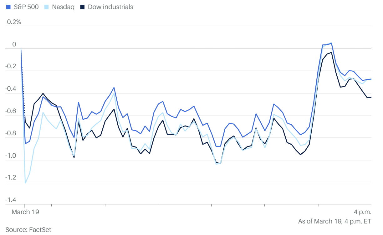 今日美股三大指數收盤集體走低,但過程猶如雲霄飛車 。早盤受中東戰火升級影響,三大指數一度深跌,但在最後一小時因油價回吐漲幅而收復大部分失地 。