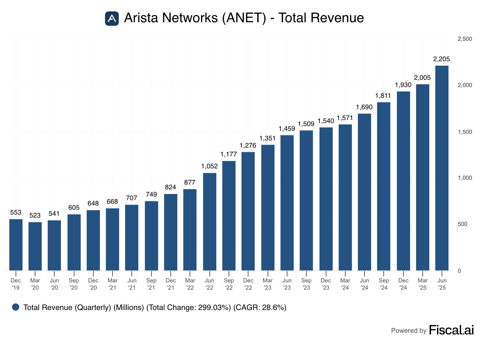 核心產品:雲端網路交換器(Cloud Networking Switches)、可程式化作業系統(EOS)、路由平台、AI 網路基礎設施