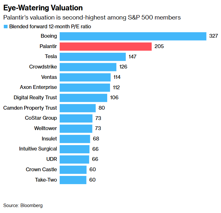 股價近期大漲後回落,預期市盈率205倍,遠超標普500平均22倍,成為科技股估值最高之一。