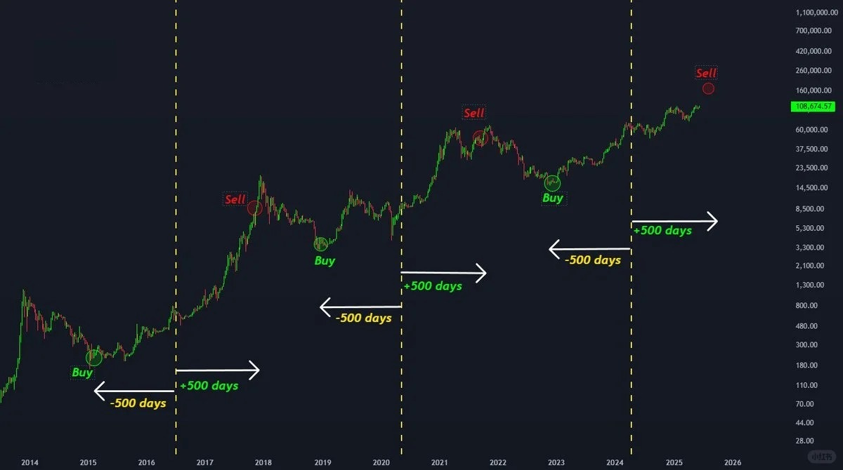 圖中標註了歷史上的「Buy」點(通常在減半前或減半後一段時間的低谷)和「Sell」點(通常在減半後達到價格高峰)。「-500 days」指的是距離減半約 500 天左右的低點,而「+500 days」則是減半後 500 天左右達到高峰。