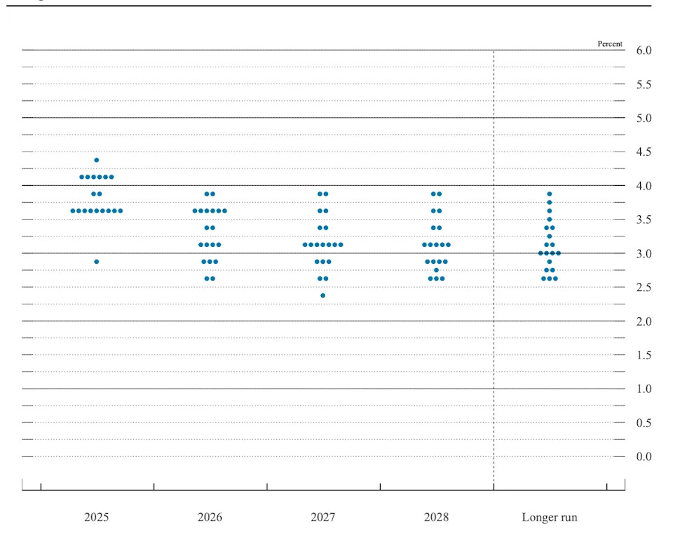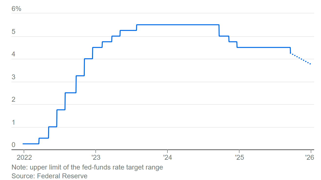 聯準會:本次 降息 25bps 至 4.00–4.25%;鮑威爾稱為「風險管理式降息」,因就業轉弱而通膨仍偏高。點陣圖:今年再降兩次的訊號;並示意 2025 年再降兩次、2026 年再降一次。SEP 上調今年經濟成長預估,通膨/失業率預測大致持平;就業下行風險上升。