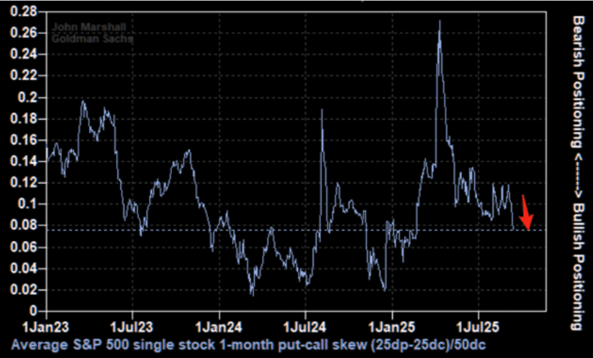 高盛證券分析選擇權市場,近期 單一股票的 put/call skew 顯示出愈來愈明顯的 看漲期權佈局。Put-Call Skew 是衡量市場對下行風險 vs 上行潛力偏好的工具。當投資人願意支付更高的保費來購買 put(看跌期權)時,skew 會顯示市場對保護性需求的增加,代表投資人對下行風險的擔憂。而當 skew 收斂甚至反轉,意即 call(看漲期權)的需求相對更強,這往往反映投資人對上行行情的追捧。