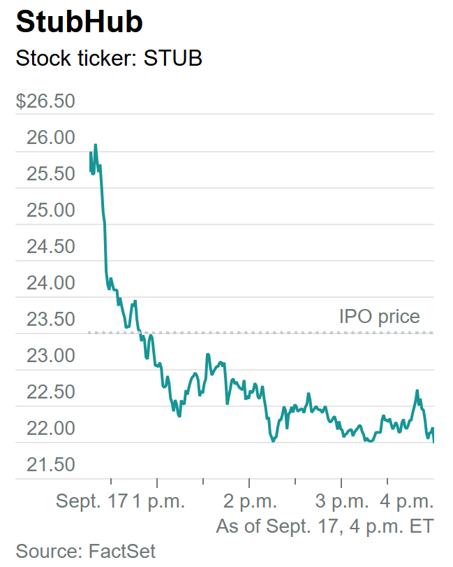 StubHub(STUB):IPO 首日,開盤 $25.35,收跌 -6.4% 至 $22,少見跌破承銷價的 IPO 新股。