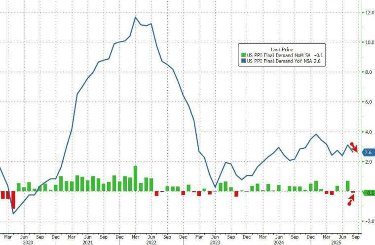 美國 8 月 PPI 同比 +2.6%(6 月來新低,低於預期 3.3%)。核心 PPI 同比 -0.1%。