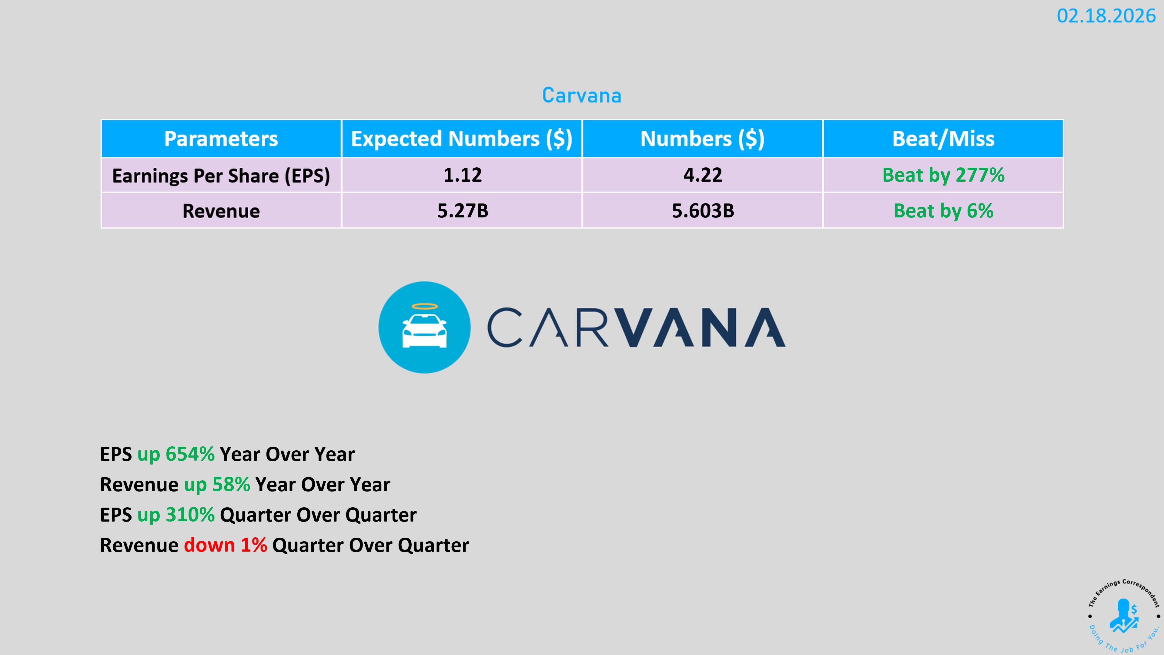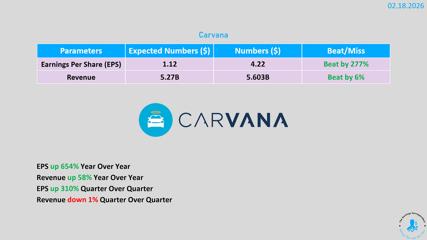 Carvana (CVNA):財報「見光死」,雖然營收年增 58% 達 56 億美元,但調整後 EBITDA 為 5.11 億美元,低於預期的 5.35 億美元 。受市場對成長見頂的擔憂及做空機構指引隱患影響,股價暴跌逾 20% 。