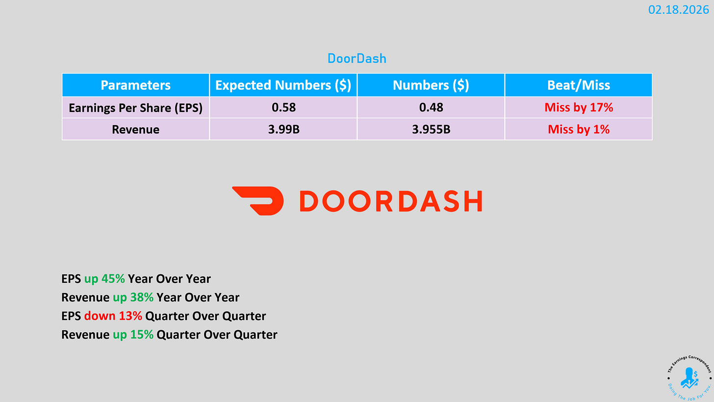 DoorDash (DASH):Q4 財報錯綜,營收 39.6 億美元與每股收益 0.48 美元均低於分析師預期,但毛訂單總額 (GOV) 年增 39% 達 297 億美元,超出市場預期 。股價在盤後經歷劇烈波動,先跌 7% 後反彈 10% 。