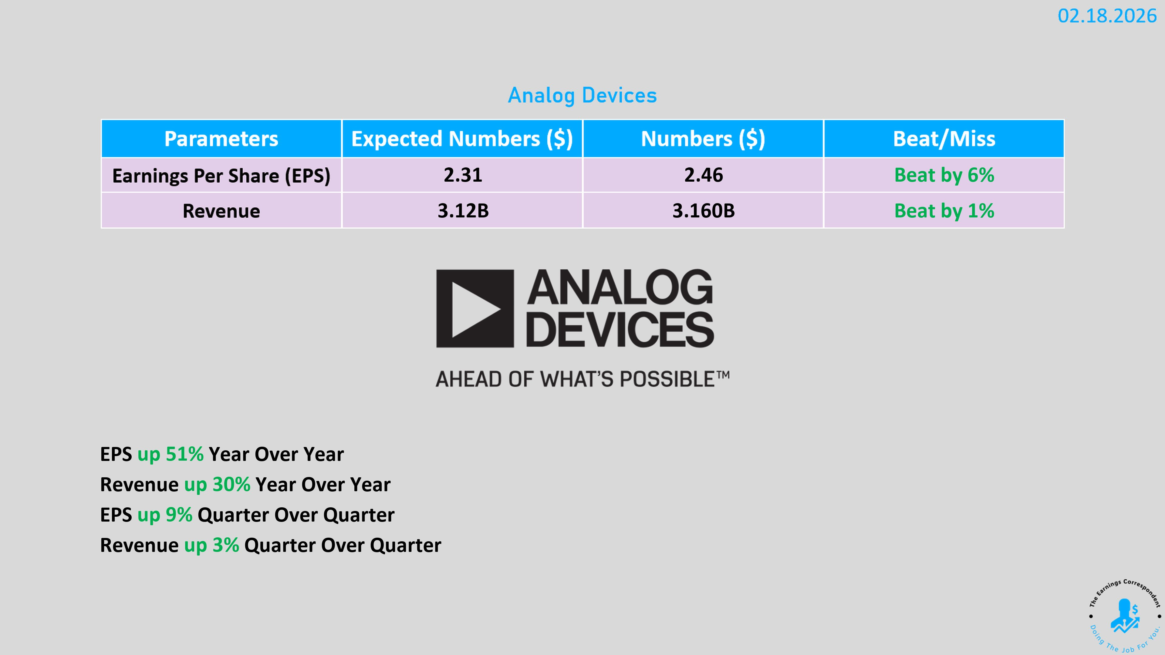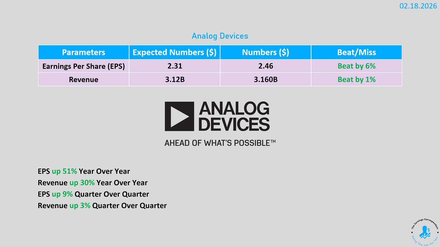 Analog Devices (ADI):業績驚艷,Q1 營收 31.6 億美元(年增 30%),每股收益 1.69 美元(年增 117%)。受工業與數據中心強勁需求帶動,公司上調 Q2 指引,營收預計達 35 億美元,高於市場預期的 32.3 億美元 。股價受此激勵大幅走高 。