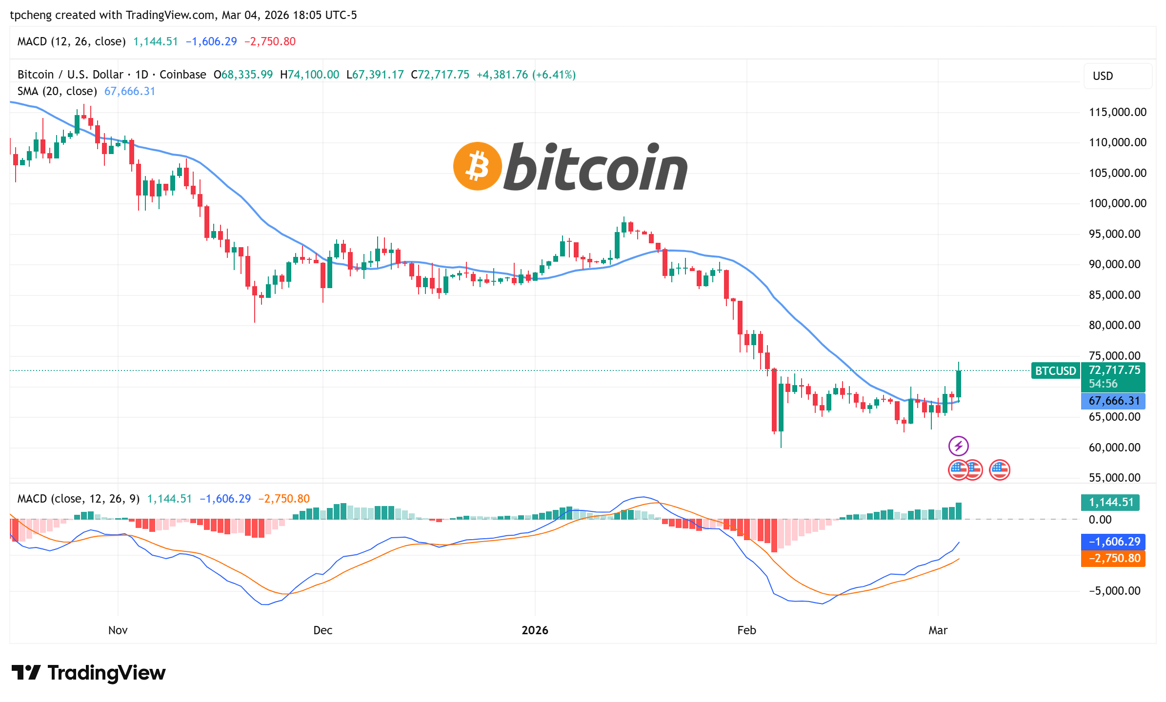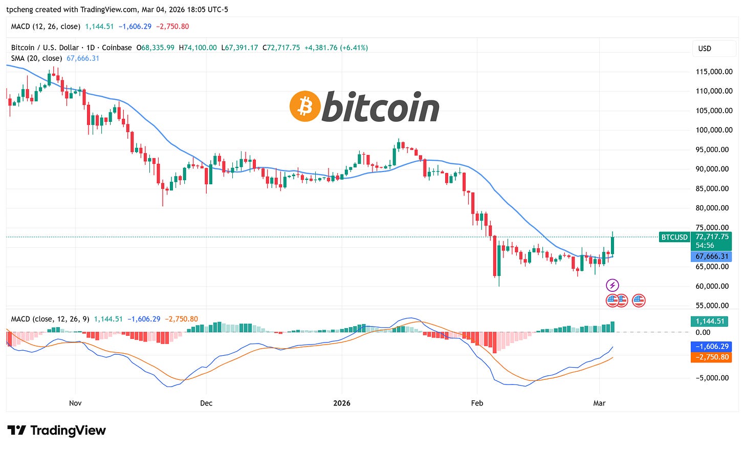 比特幣今日表現亮眼,大漲 8% 突破 73,000 美元關卡 。除了作為避險資產的屬性外,兩大關鍵利多推動了加密貨幣市場: