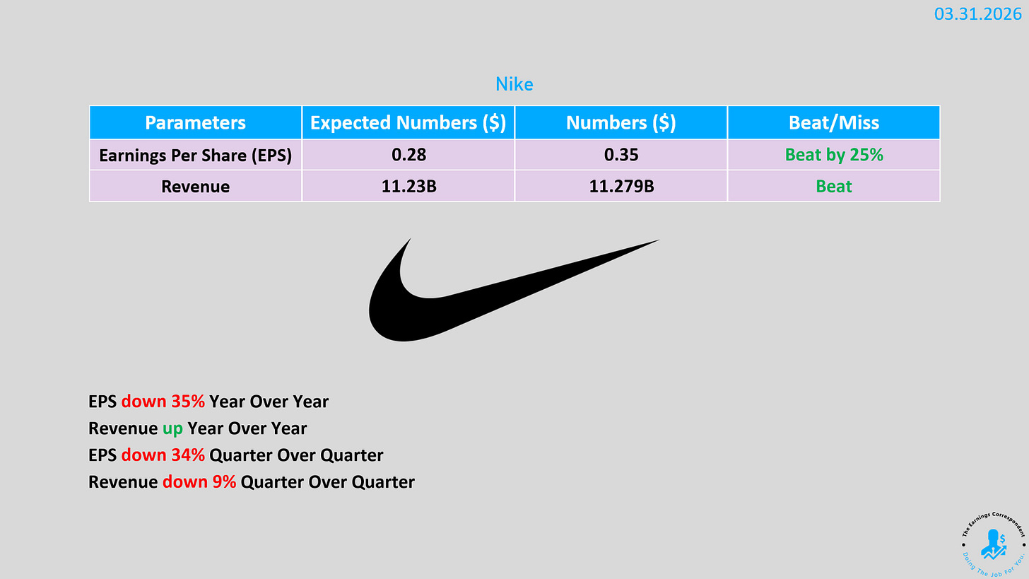 Nike(NKE): 盤後股價下跌逾2.6% 。雖然第三季調整後 EPS 為0.35美元優於預期,但大中華區營收下降11%,且北美關稅導致毛利率承壓(130個基點的逆風) 。Converse 品牌營收更是暴跌35% 。執行長 Elliott Hill 坦言轉型工作尚未完成 。