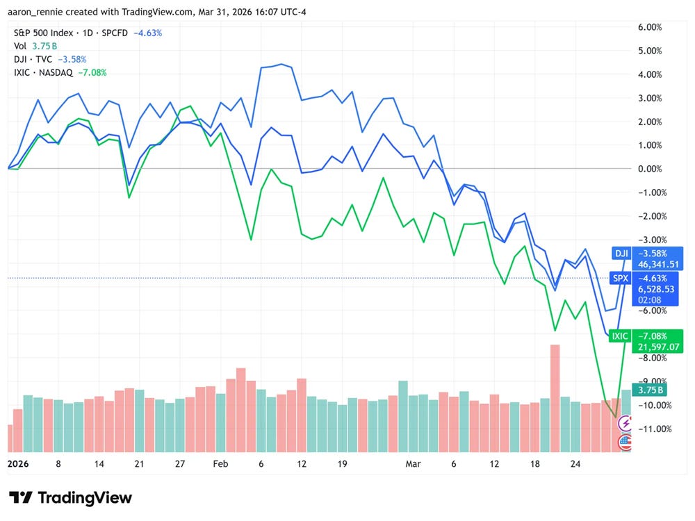 總結與展望: 市場在第一季末完成了從「戰爭恐慌」到「和平希望」的初步切換。投資者將在週三迎來 ADP 私人就業數據、零售銷售與 ISM 製造業指數,這將揭示在高油價衝擊五週後,美國經濟的真實韌性 。雖然地緣政治出現轉機,但 Nvidia 在 Q1 仍下跌約 8%(其心理關口200日線已跌破),顯示 AI 投資已進入「Show Me(看實績)」階段 。