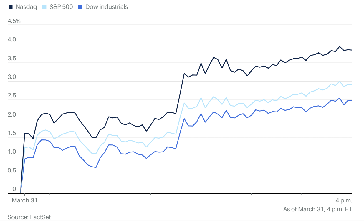 2026年3月31日,美股三大指數在第一季度的最後一個交易日上演了戲劇性的「大反攻」。儘管整個三月份受中東戰火衝擊而表現陰霾,但週二憑藉地緣政治局勢的轉機與AI龍頭企業的重磅投資,市場信心大幅回升 。道瓊工業指數飆升超過1,100點,那斯達克指數更創下超過3.8%的單日漲幅 。
