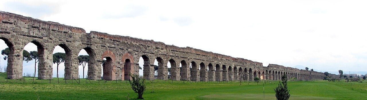 建於公元52年克勞狄一世時期,全長41英里,多為地下結構,靠近羅馬時抬升至拱門。遊客可在阿皮亞古道公園近距離欣賞其連續坡度的拱門設計。
