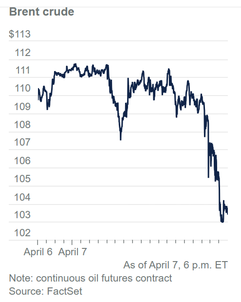 市場反應:消息傳出後,標普500與那斯達克期貨應聲跳漲 0.8% 至 1% 。原油價格隨即暴跌,布蘭特原油期貨在盤後交易中重挫 5.4%,西德州原油(WTI)則下跌約 4% 至每桶 108 美元左右 。