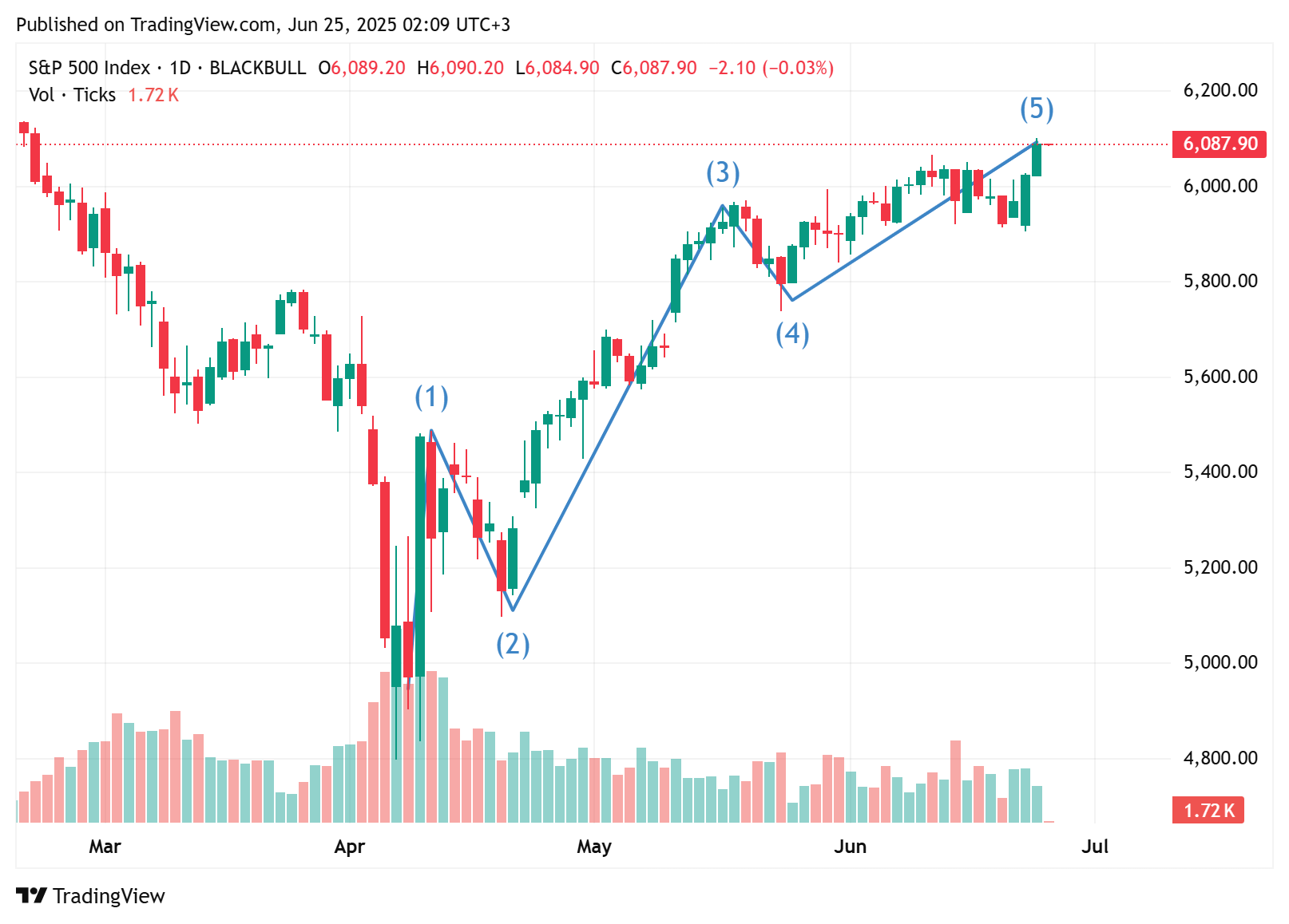 推測處於第五浪最後階段,可能會出現突然跳空重挫,標誌牛市結束。