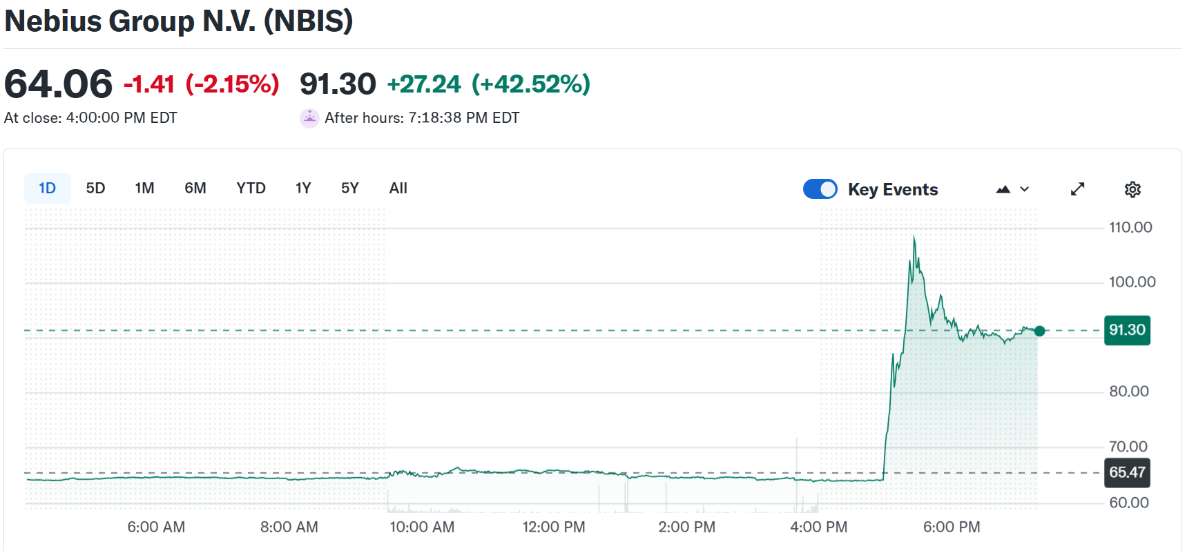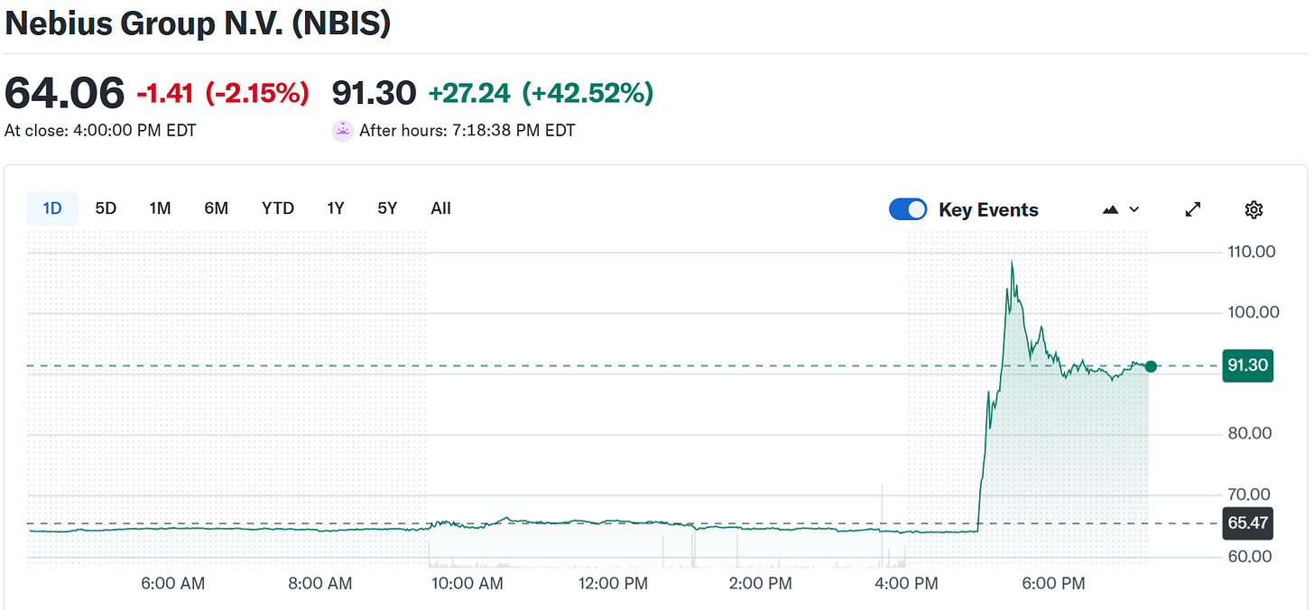Nebius (NBIS) 與 微軟 (MSFT) 簽署 AI 雲端運算合約,價值 174–194 億美元,至 2031 年。由美國 紐澤西資料中心提供 AI 算力。盤後 Nebius 股價一度暴漲 60%。