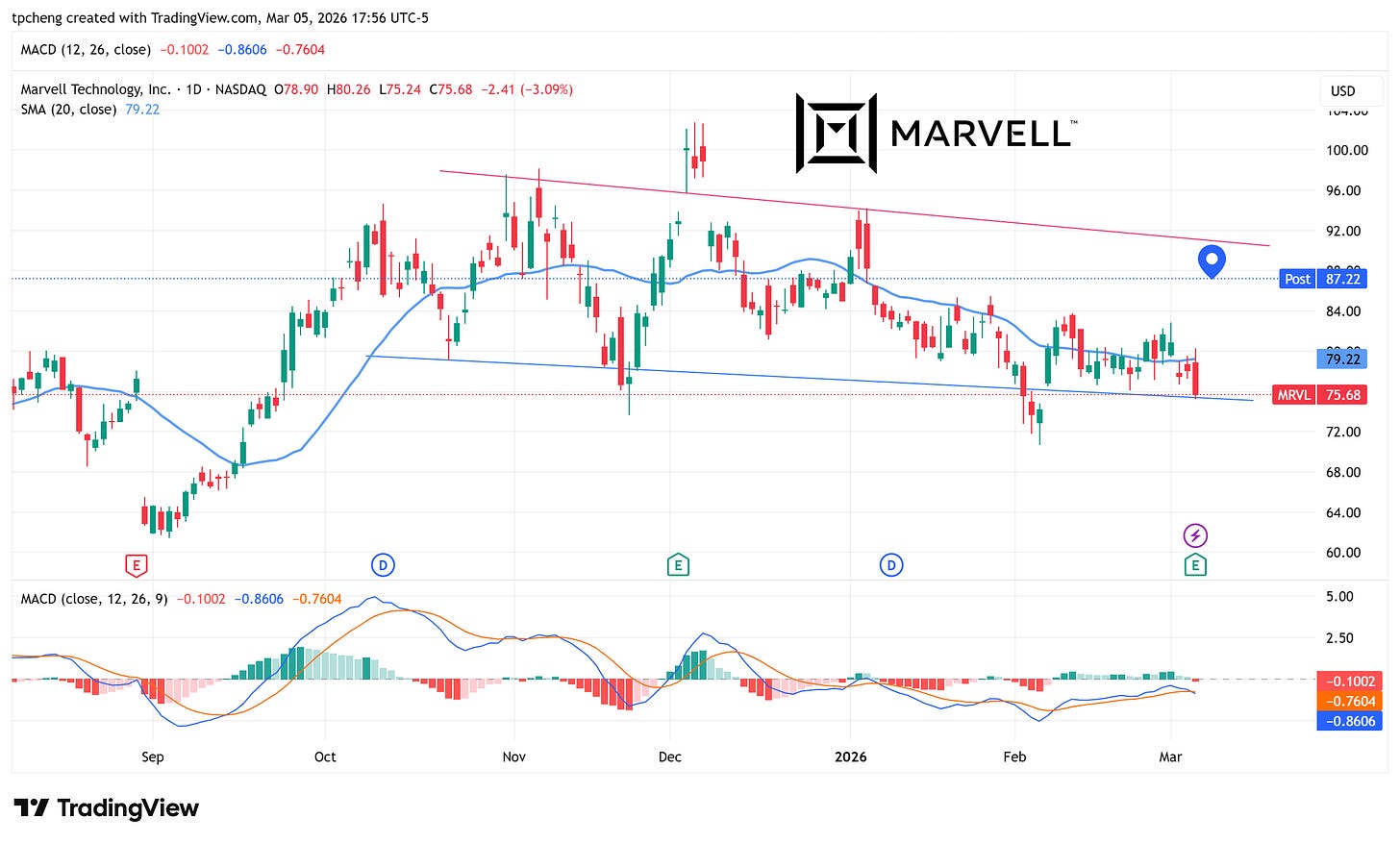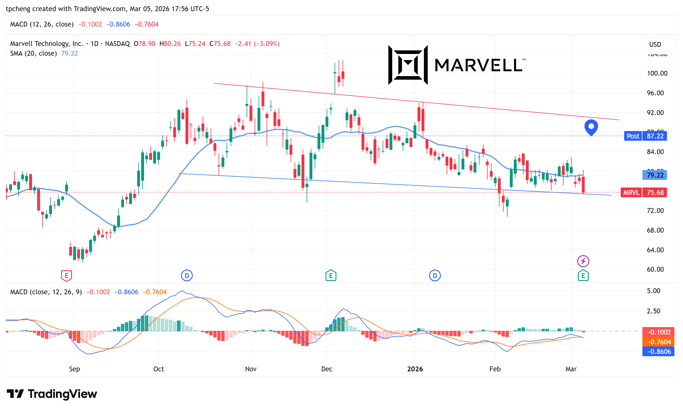 驅動力:受惠於 Big Tech(亞馬遜、微軟等)高達 6,300 億美元的 AI 資本支出,Marvell 的客製化晶片(ASIC)與矽光子技術(Photonic Fabrics)需求正以紀錄速度增長。