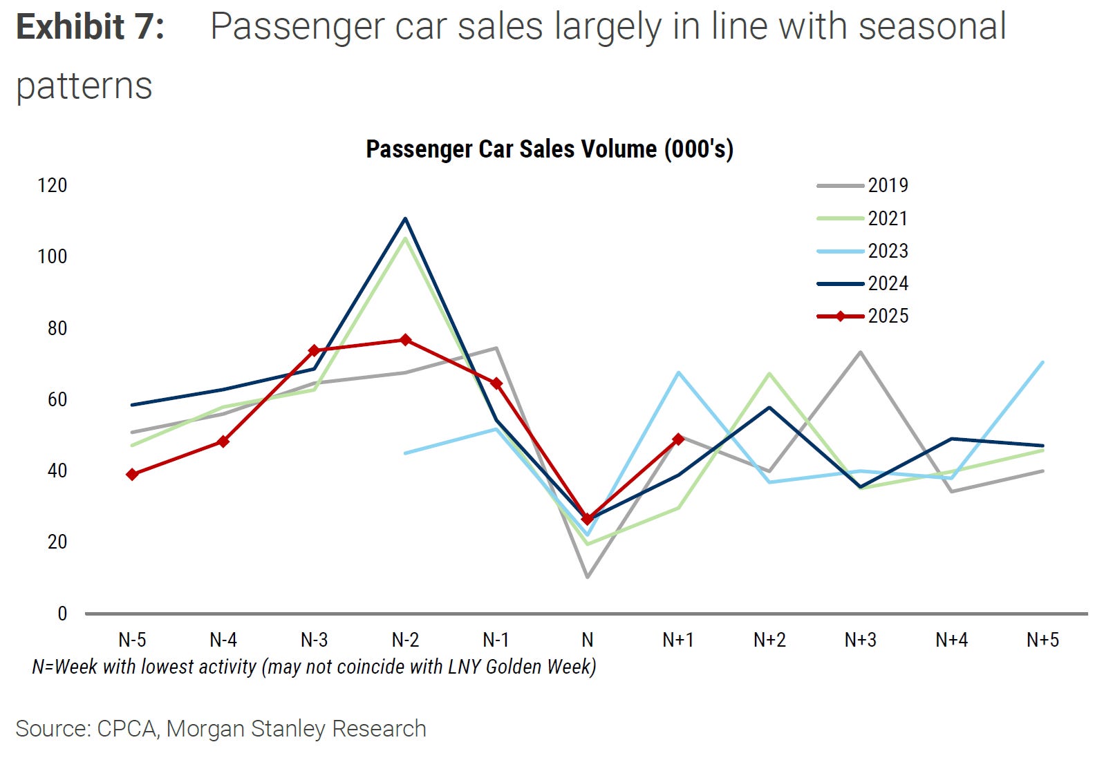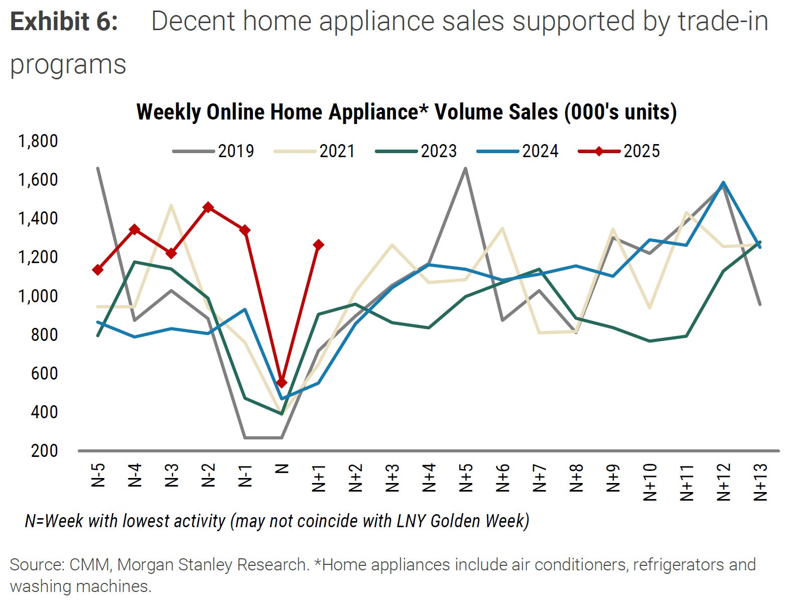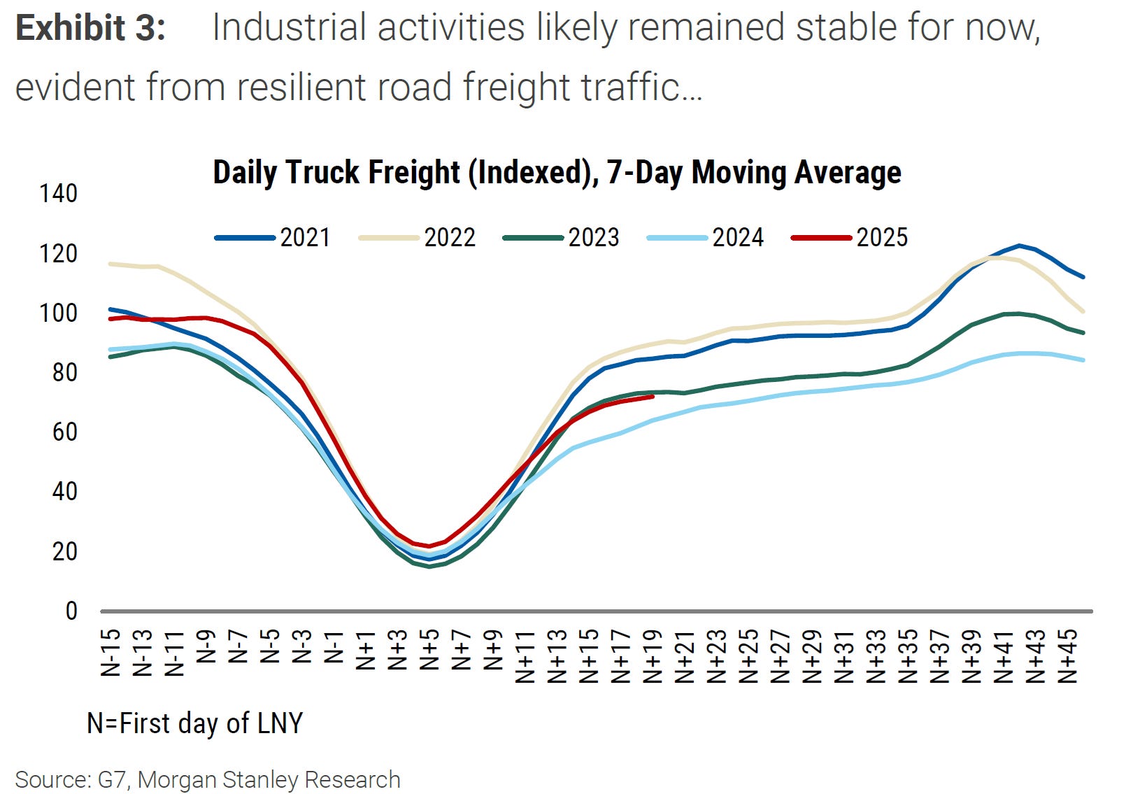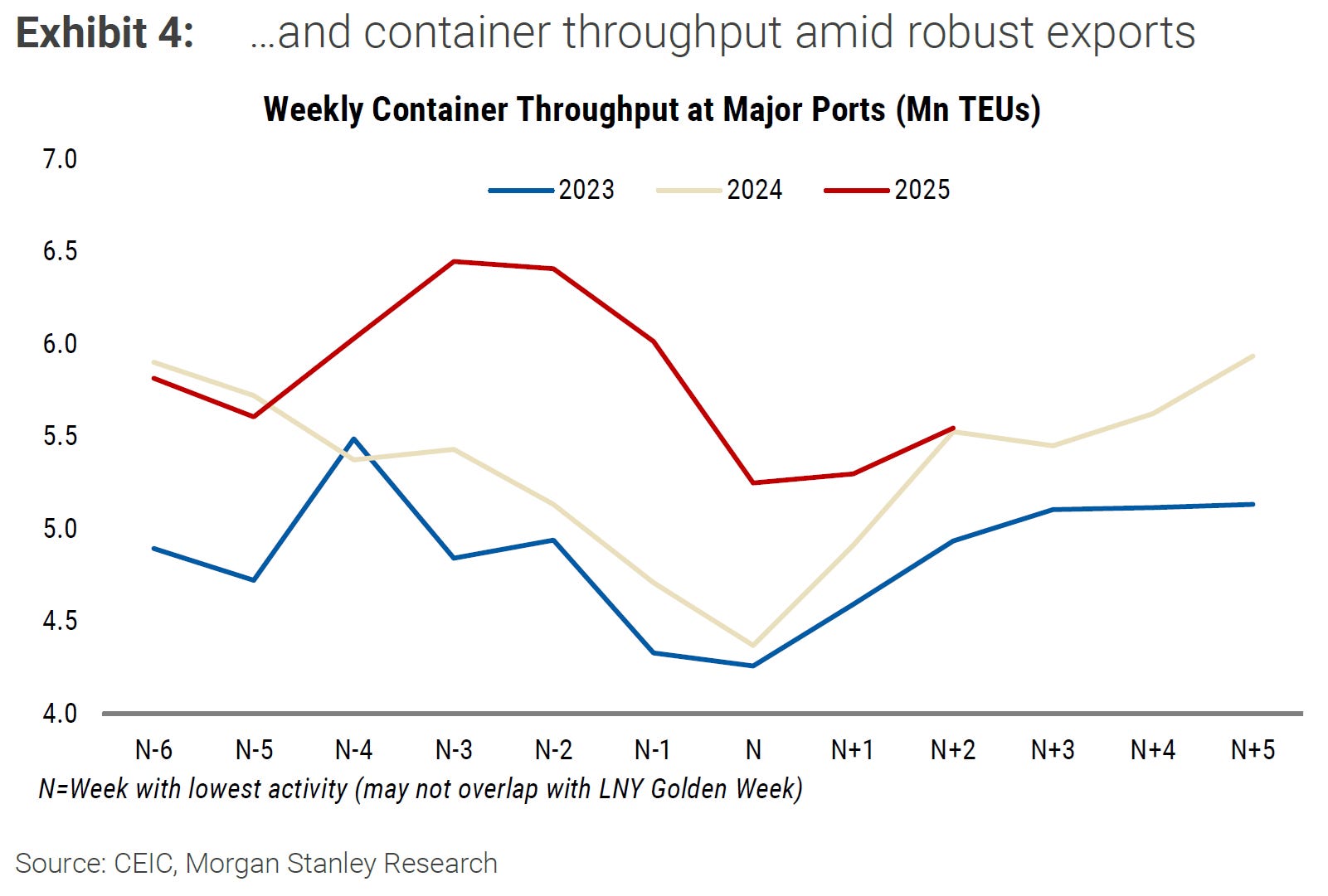 製造業活動依然強勁,從公路貨運交通(圖表3)來看,這是一個很好的指標,因為中國擁有高度多元化的供應鏈以及高效的即時生產模式。製造業活動的一個主要驅動因素可能是出口仍然保持韌性(圖表4),這可能是趕在川普關稅政策出爐前先備貨有關。此外,消費大致保持穩定,受到汰舊換新計劃的支撐(圖表6)。勞動市場的某些領域與去年相比也保持穩定(圖表8)。