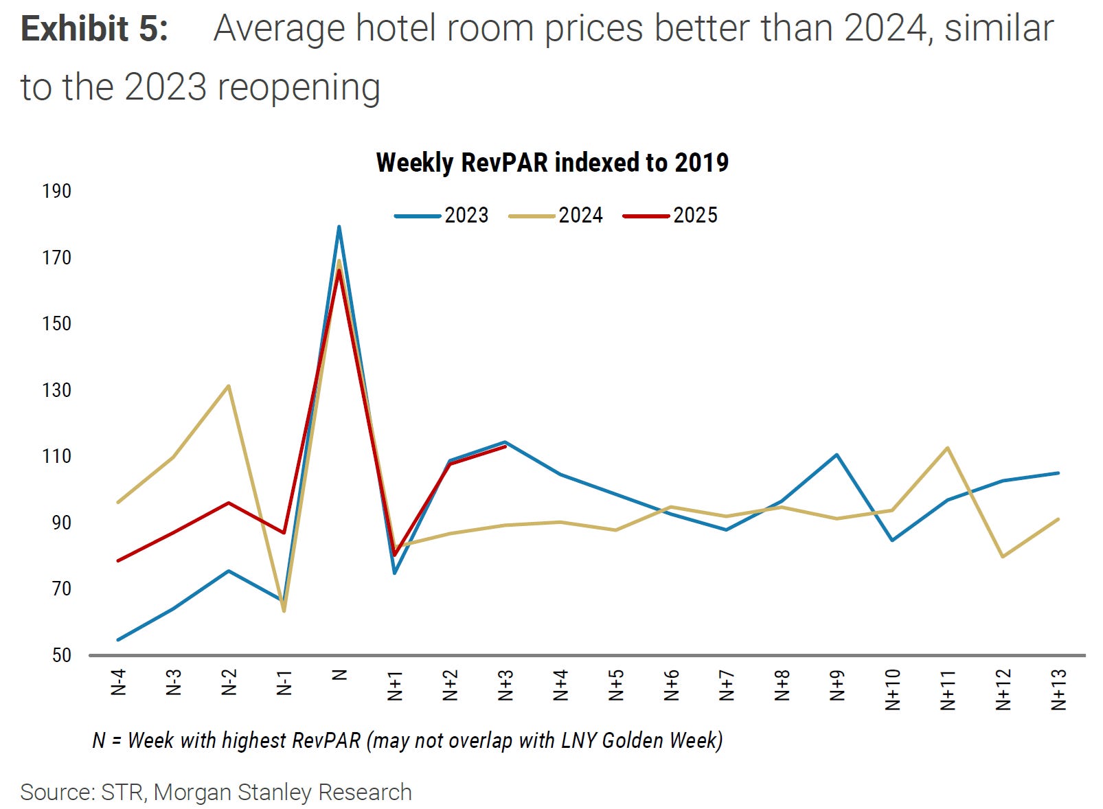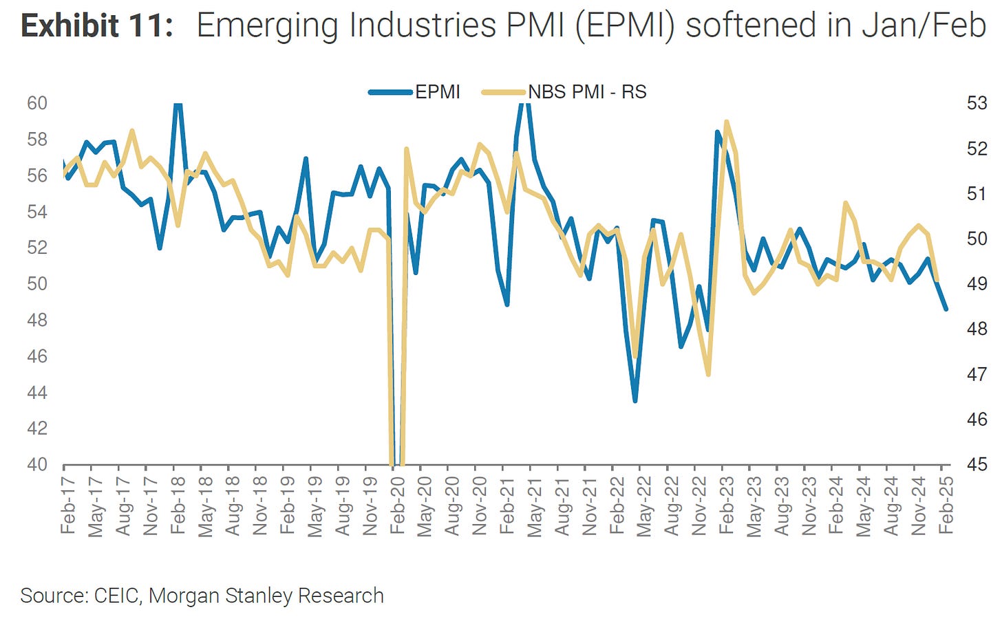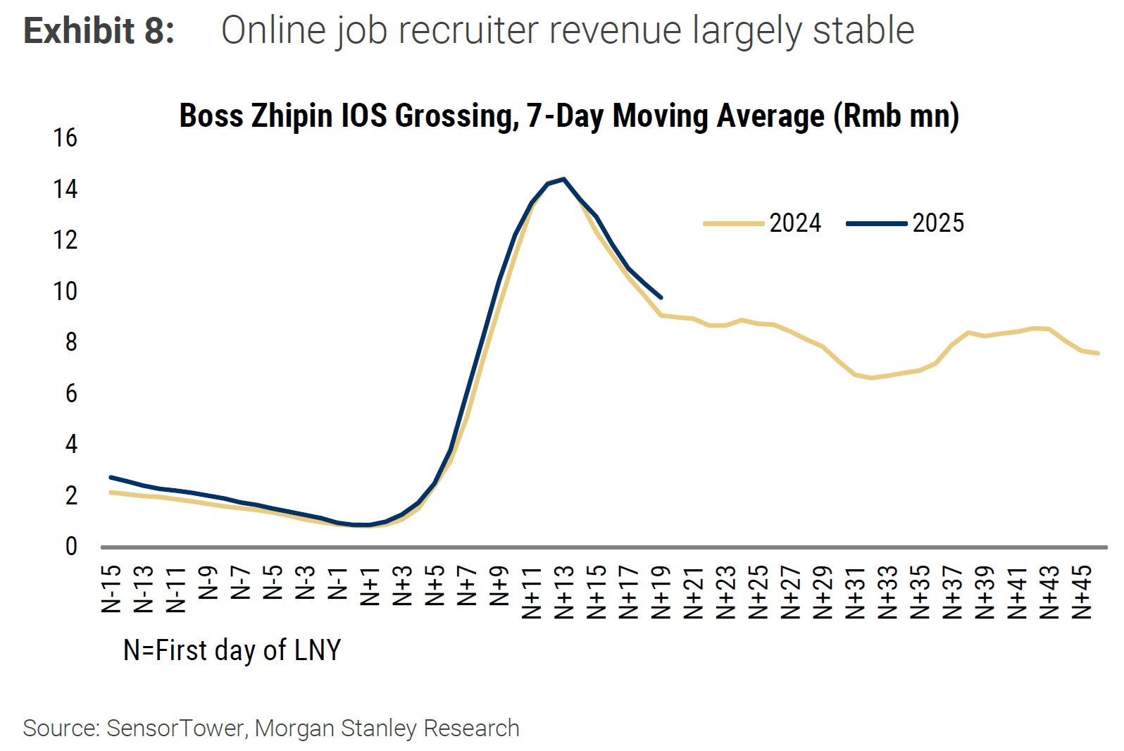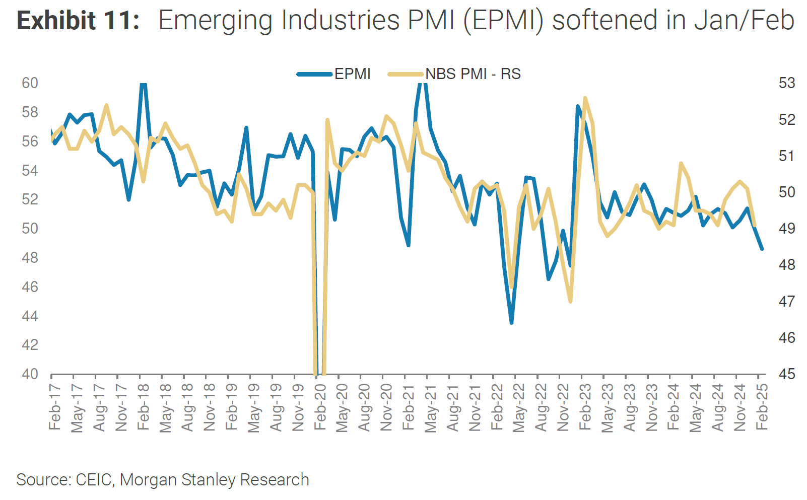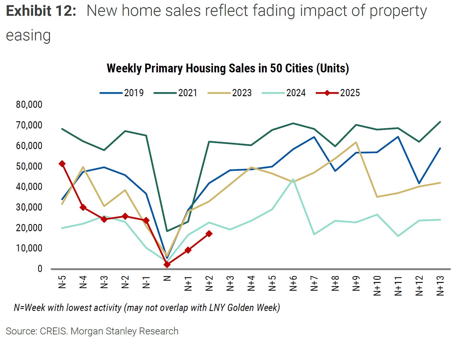 製造業活動依然強勁,從公路貨運交通(圖表3)來看,這是一個很好的指標,因為中國擁有高度多元化的供應鏈以及高效的即時生產模式。製造業活動的一個主要驅動因素可能是出口仍然保持韌性(圖表4),這可能是趕在川普關稅政策出爐前先備貨有關。此外,消費大致保持穩定,受到汰舊換新計劃的支撐(圖表6)。勞動市場的某些領域與去年相比也保持穩定(圖表8)。