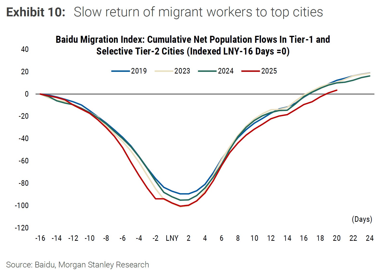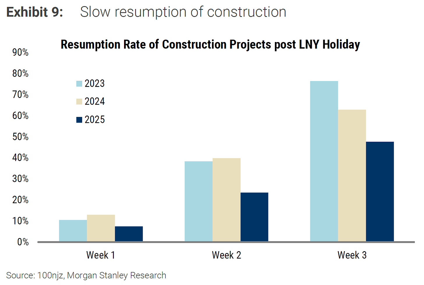春節後第3週,建築項目的復工仍然低迷(圖表9)。根據百度旅行指數(圖表10),農民工返回一線城市的速度似乎也慢於往年,這不僅反映出建築行業的低迷,還可能影響到第三產業(約15%的農民工從事建築行業,而約54%從事服務業)。此外,春節後50個城市的新房銷售回升(圖表12)低於預期,這可能反映了房地產購買限制放寬的推動力正在減弱。