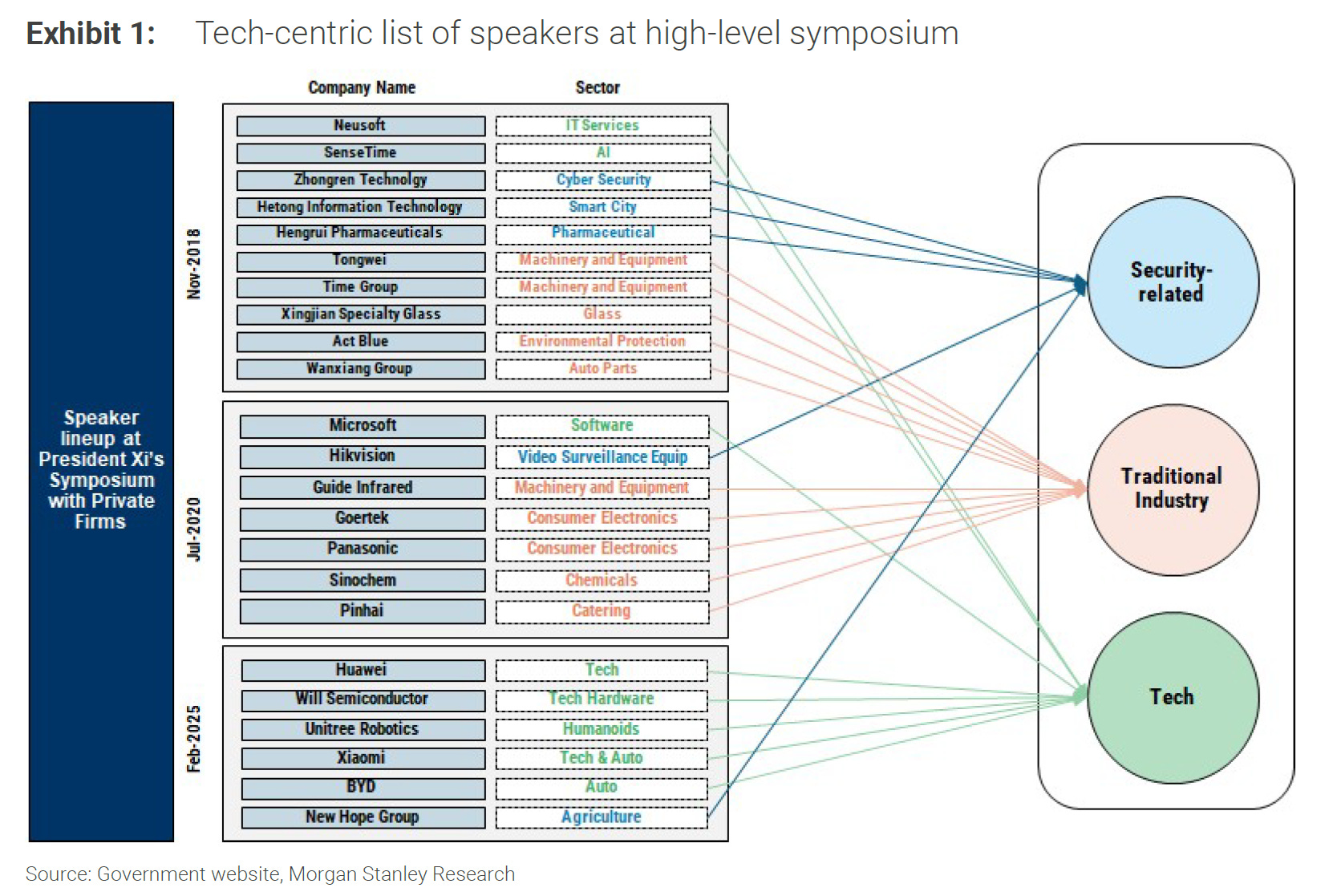 自2018年以來,習近平舉辦了三次企業家座談會,而發言者陣容的變化似乎反映了中國不斷演變的優先事項。2018年和2020年的座談會以傳統產業和供應鏈升級為主,而本週的座談會則更加側重於科技領域:AI、機器人技術和自動駕駛等新興領域成為焦點,而傳統行業的比重則有所減少。